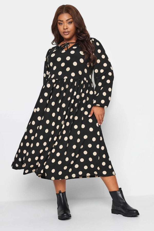 Büyük Beden Önü Bağlamalı Puantiye Desenli Uzun Kollu Midi Elbise 137626