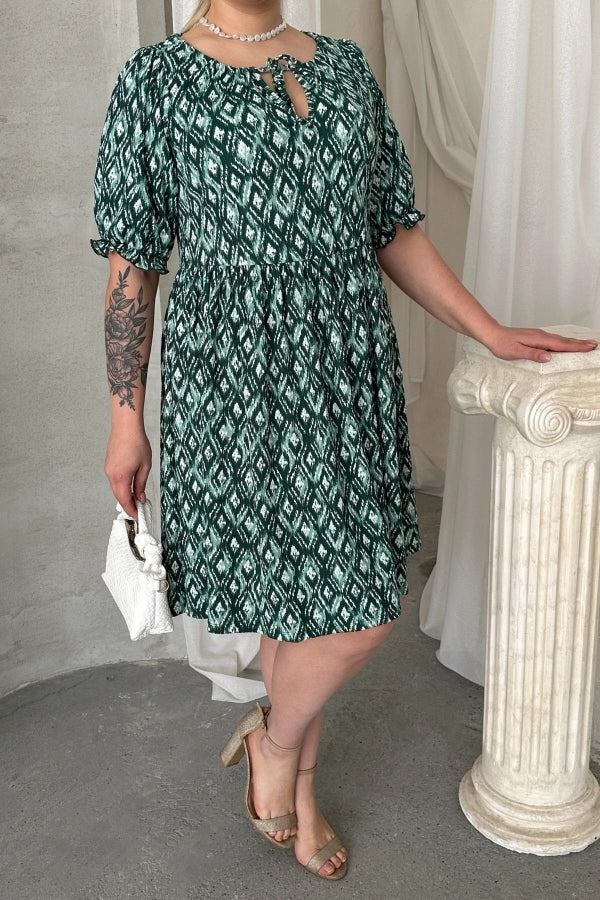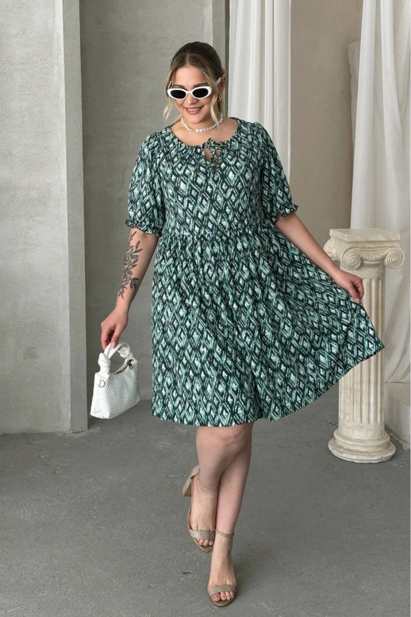 Büyük Beden Önü Bağlamalı Yarım Kollu Desenli Mini Elbise 101-8