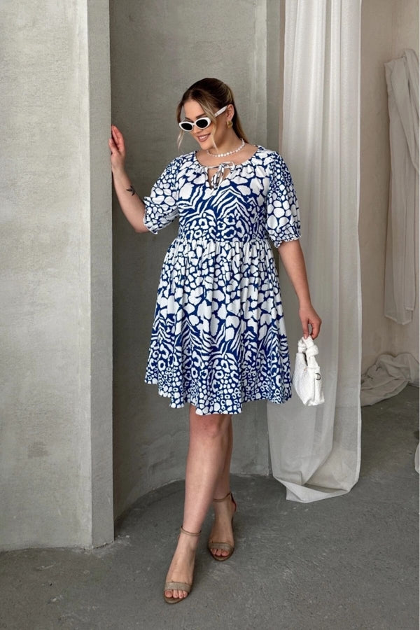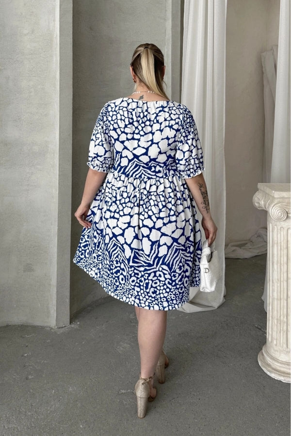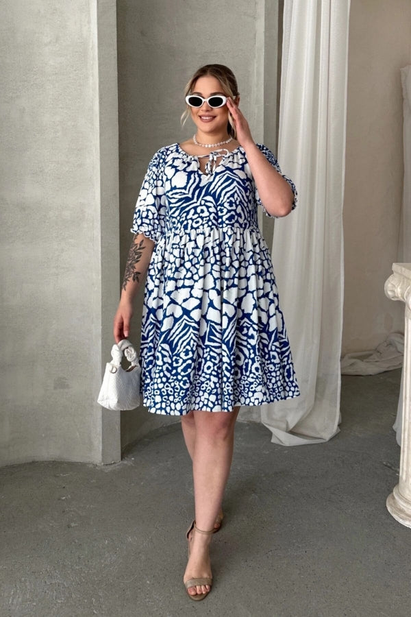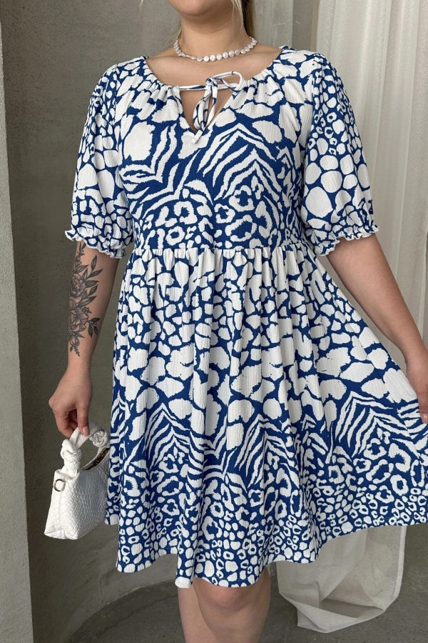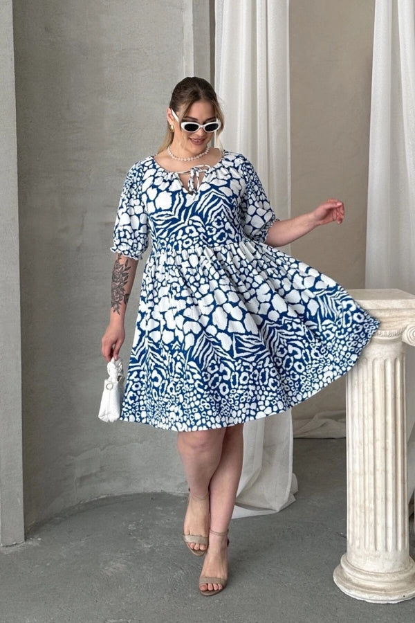 Büyük Beden Önü Bağlamalı Yarım Kollu Desenli Mini Elbise 101-9
