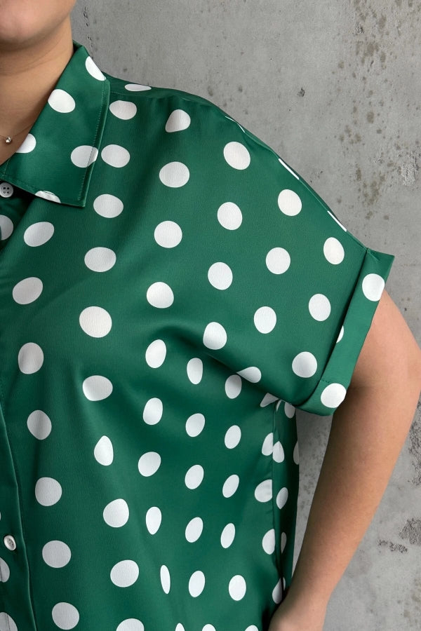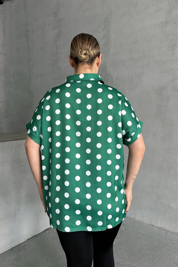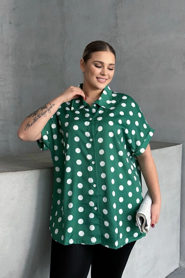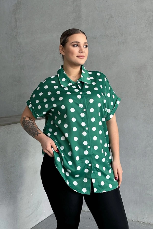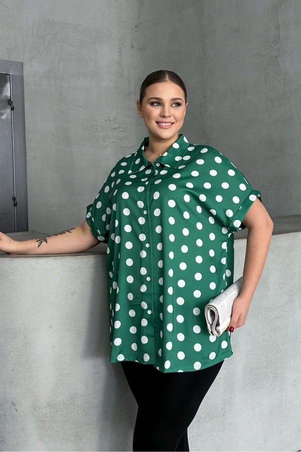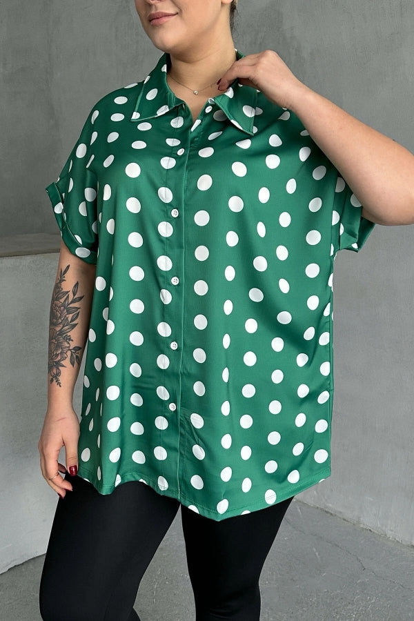 Büyük Beden Önü Düğmeli Kısa Kollu Puantiye Desenli Gömlek 303461