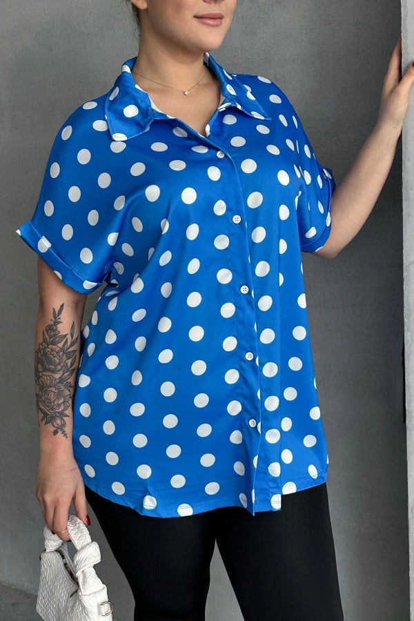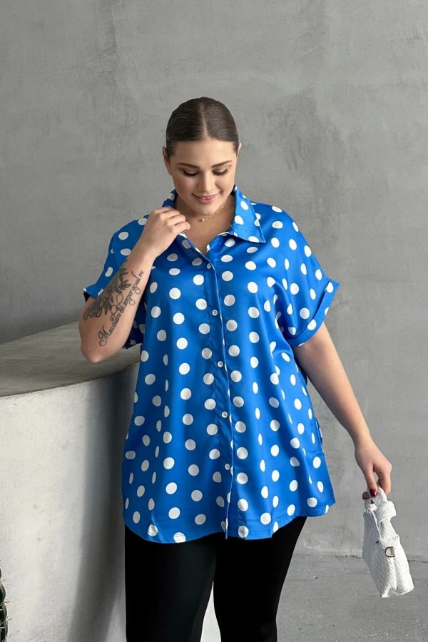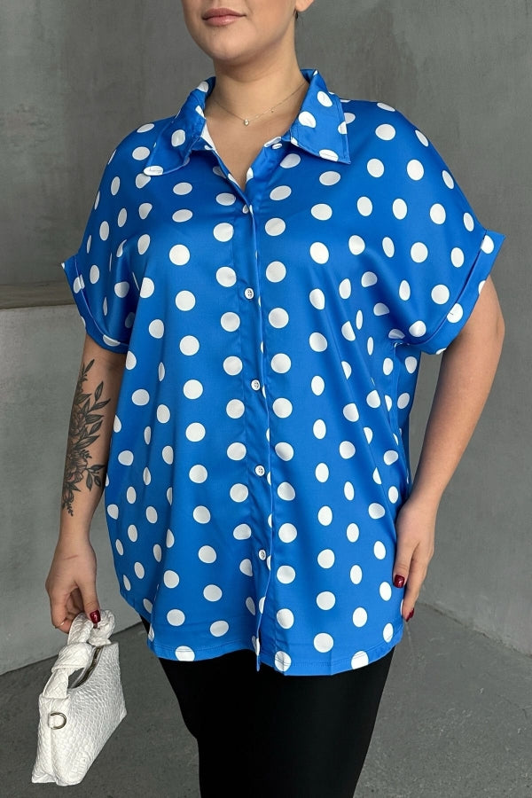 Büyük Beden Önü Düğmeli Kısa Kollu Puantiye Desenli Gömlek 303462