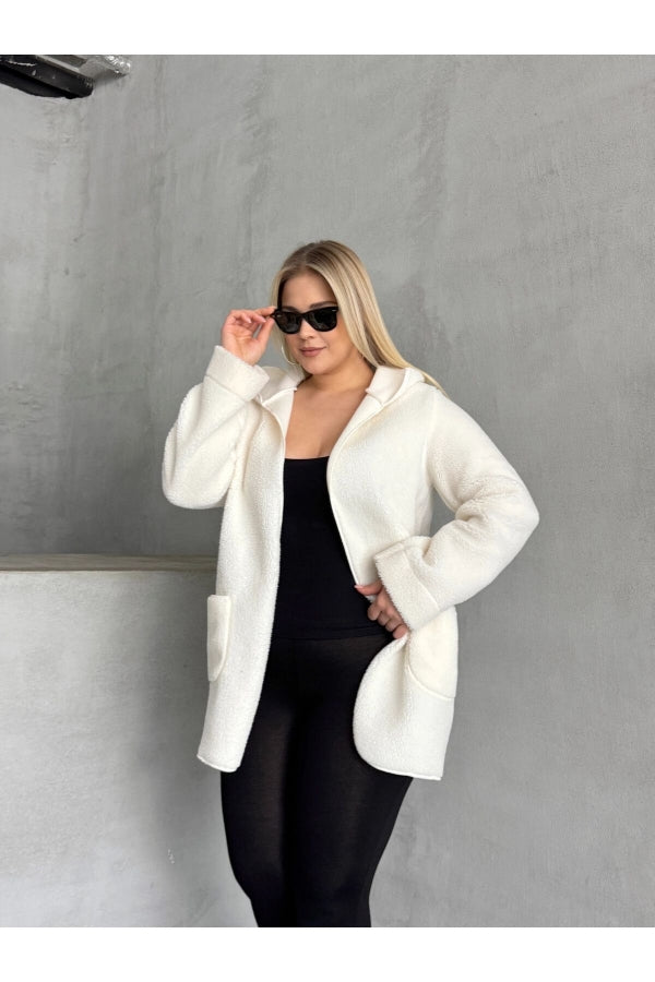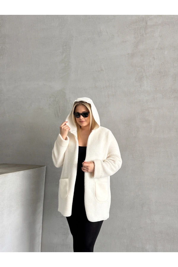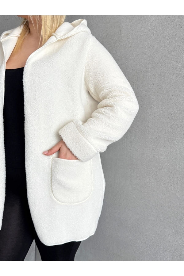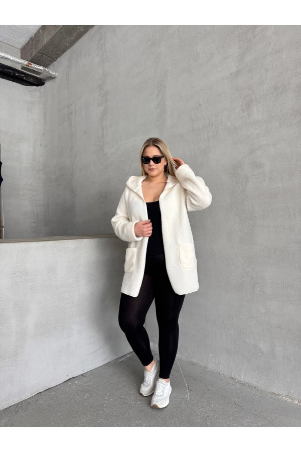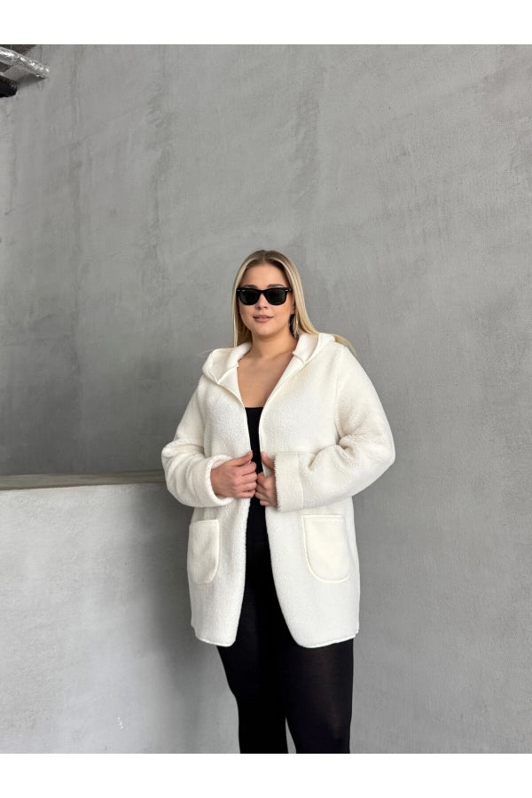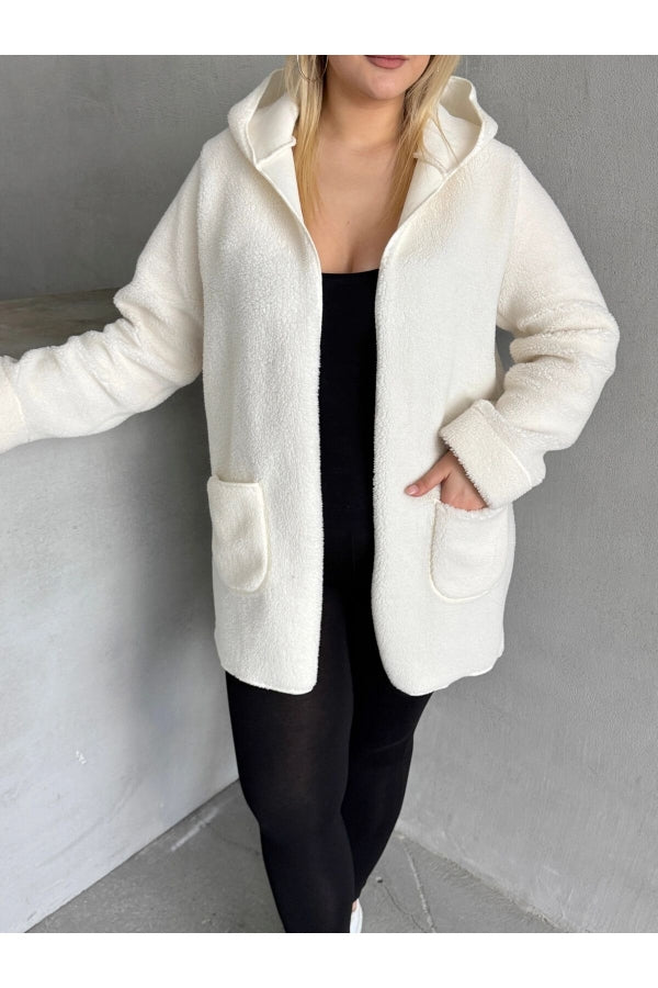 Büyük Beden Önü Kapamasız Cepli Kapüşonlu İnce Peluş Ceket 301256