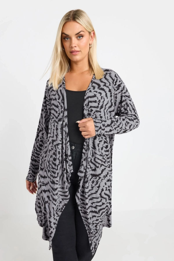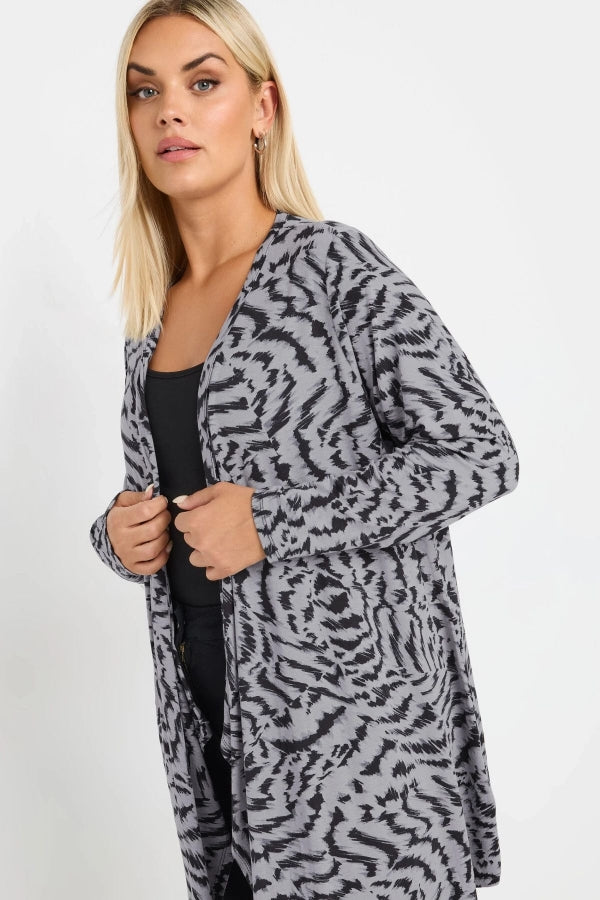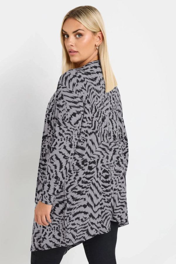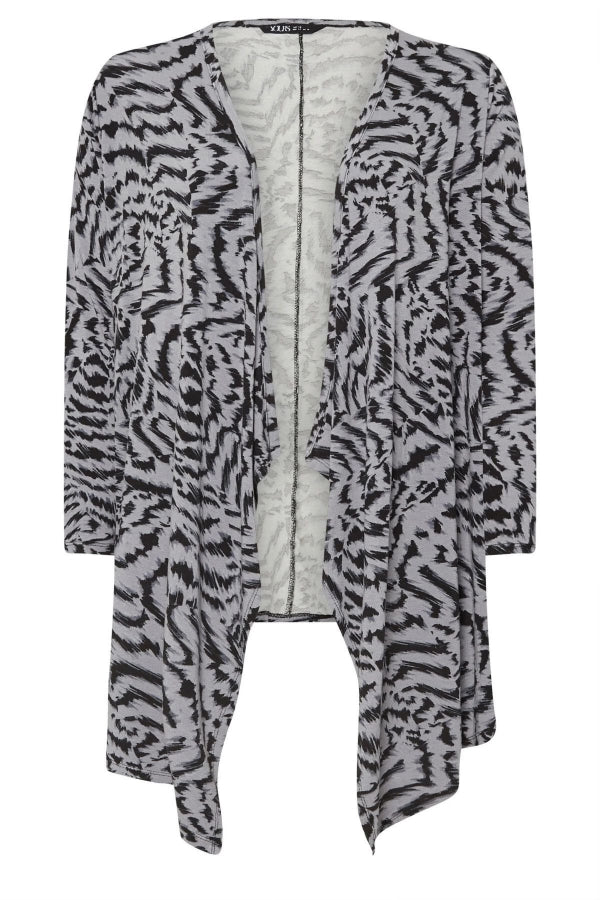 Model Detayı: Soyut desen baskısı, uzun kollu, şelale tasarımı, açık ön