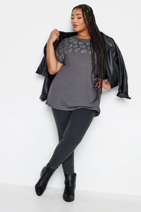 Büyük Beden Pul Detaylı Leopar Desenli Kısa Kollu T-shirt 321326