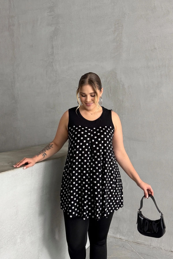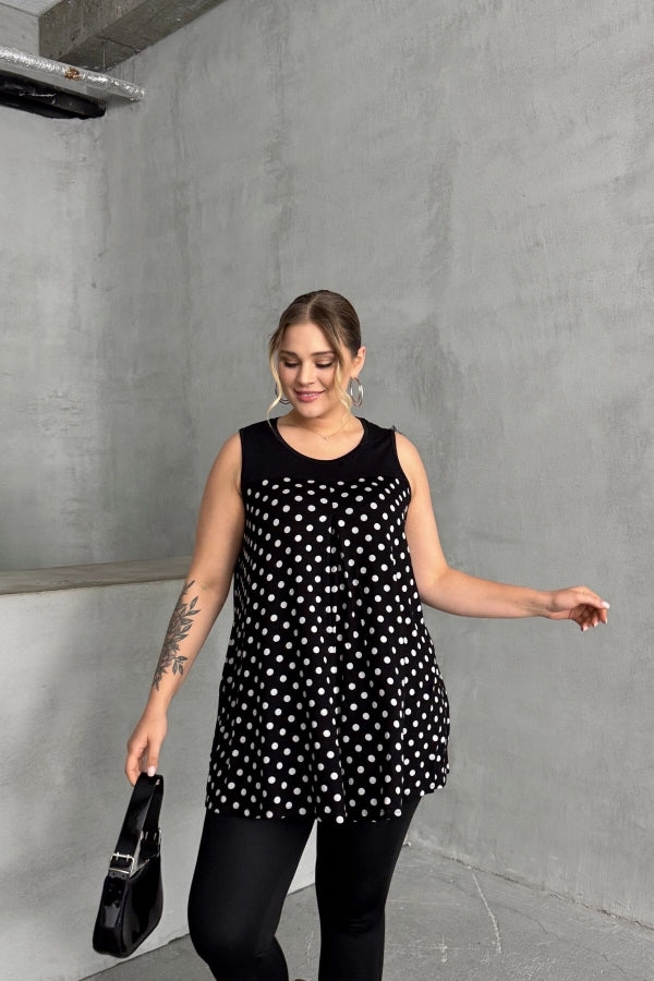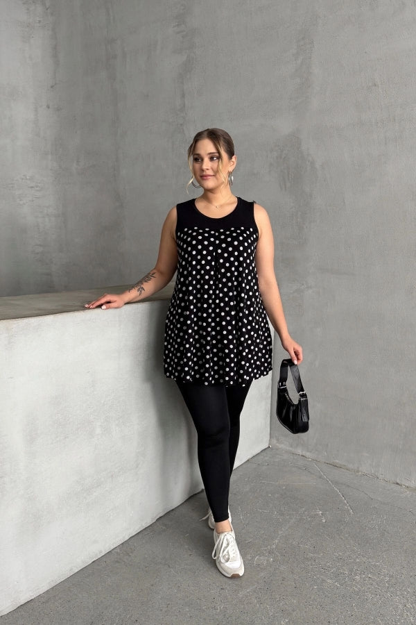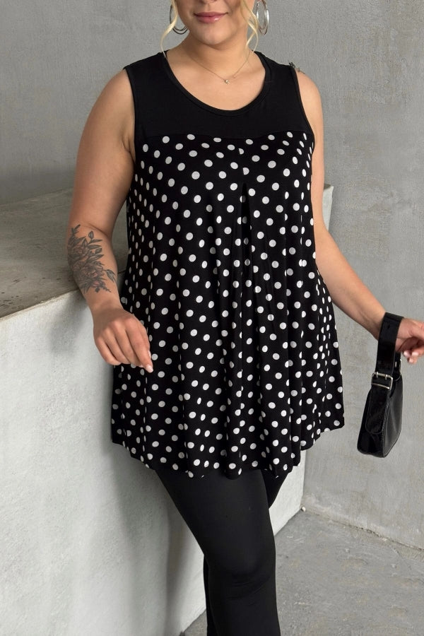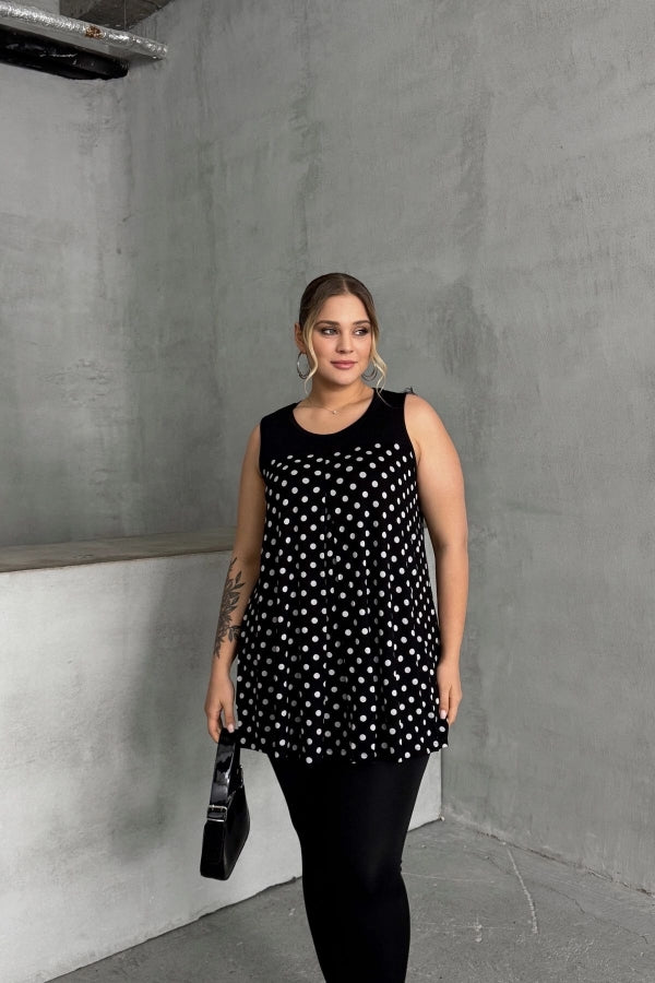 Büyük Beden Sıfır Kol Bisiklet Yaka Puantiyeli Pileli Bluz 302250