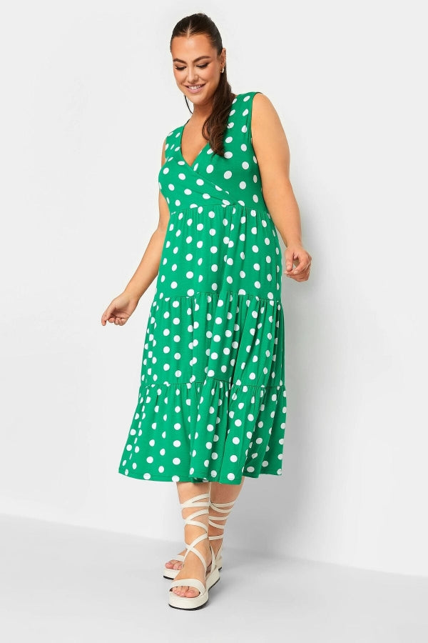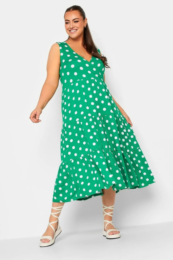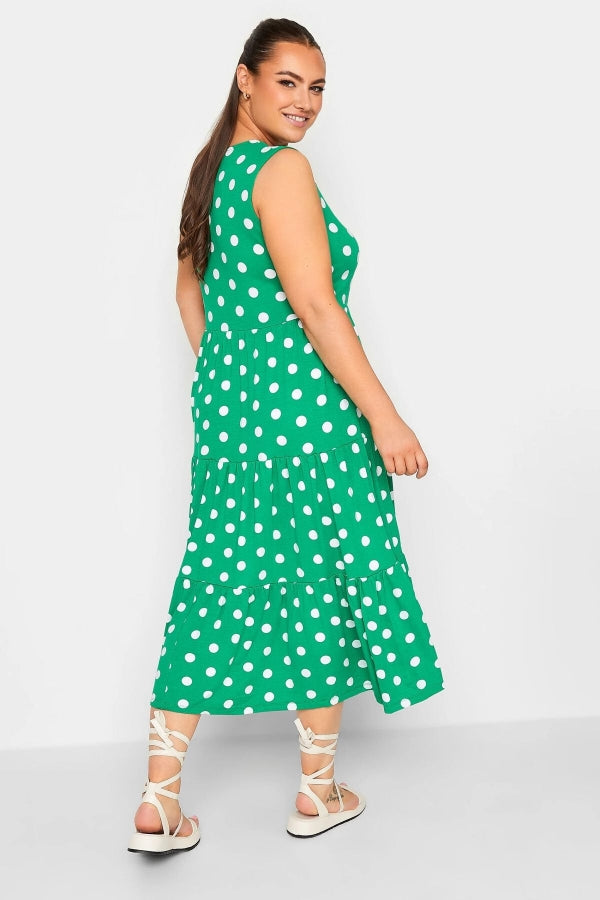 Büyük Beden Sıfır Kol Büyük Puantiyeli V Yaka Midi Boy Elbise 302354