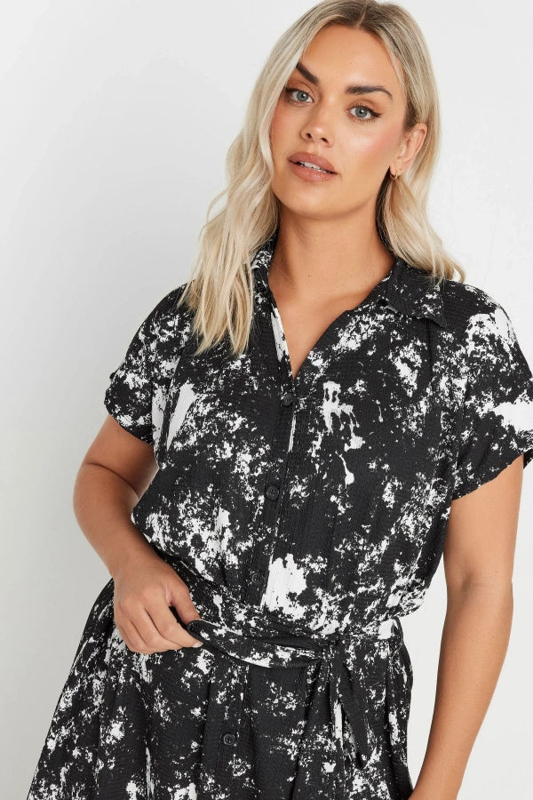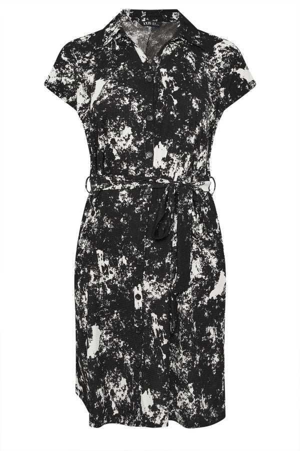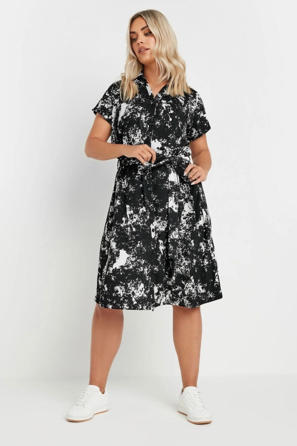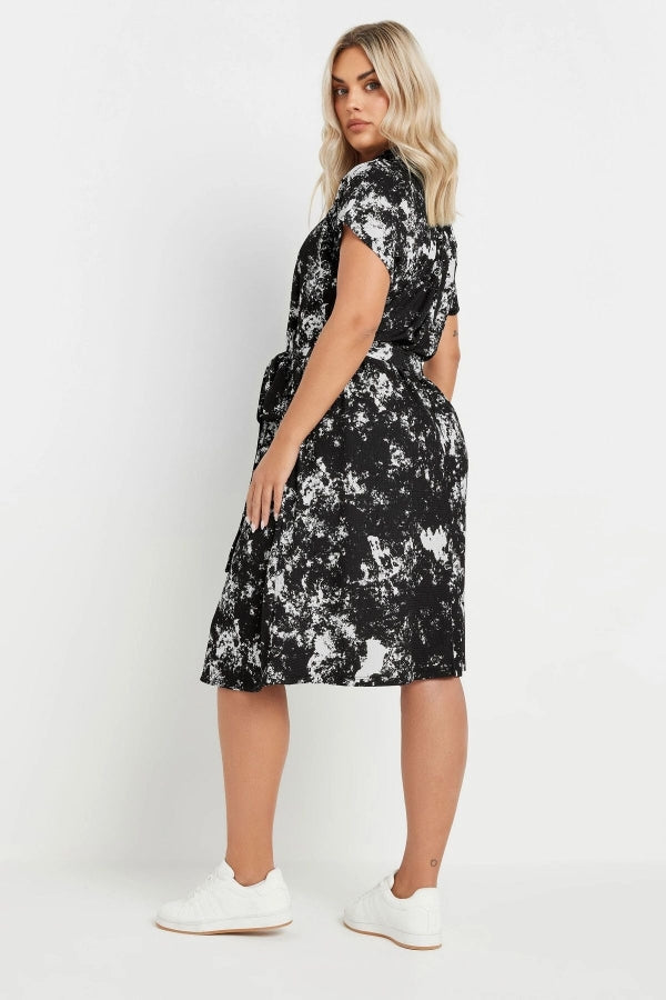 Büyük Beden Soyut Desenli Önü Düğmeli Kuşaklı Midi Boy Elbise 303330