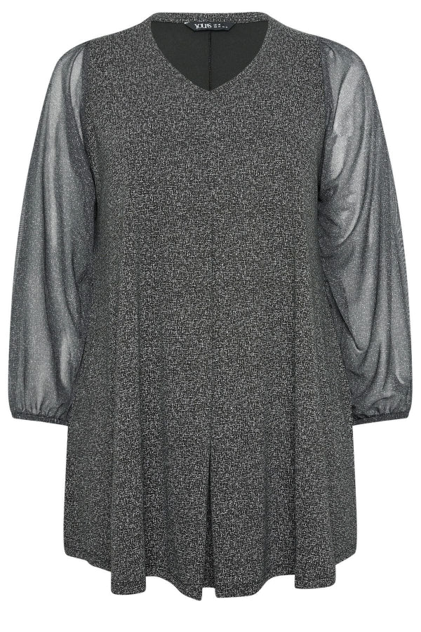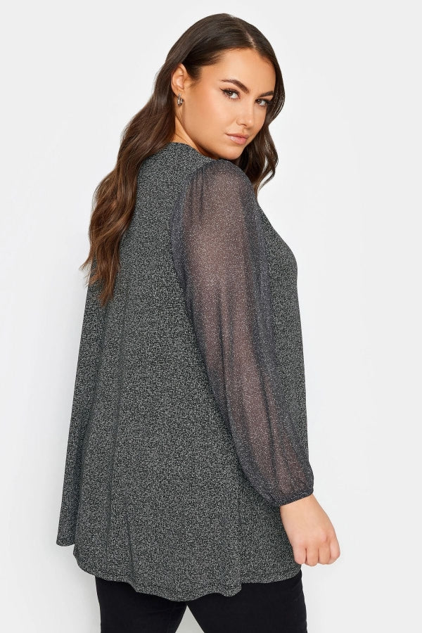 Büyük Beden Uzun Kolları Tül Detaylı Pileli V Yaka Bluz 302824