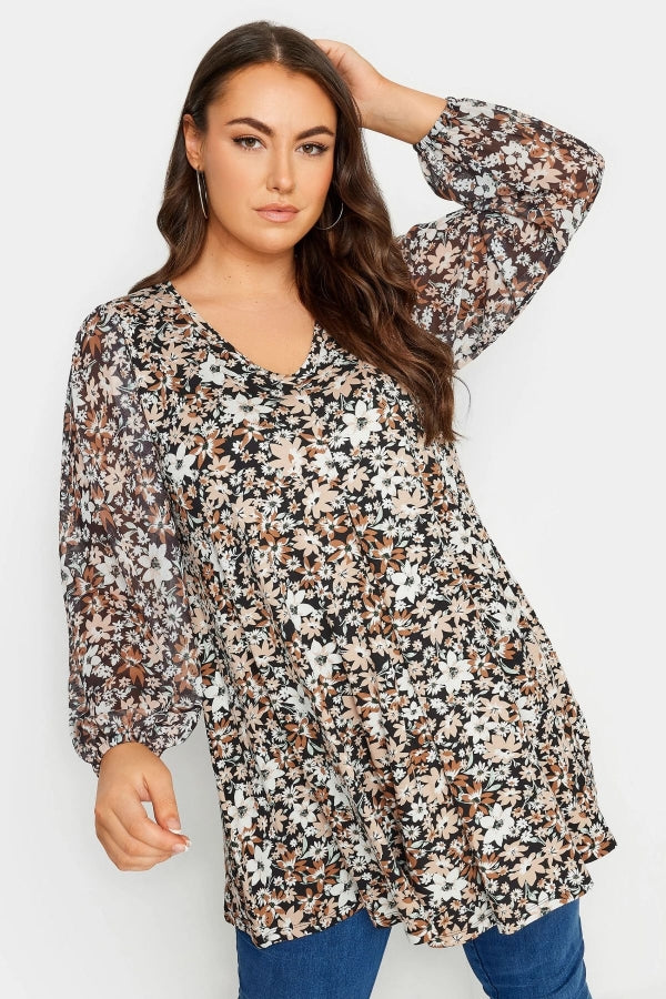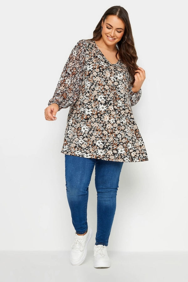 Büyük Beden Uzun Kolları Tül Detaylı Pileli V Yaka Bluz 302827