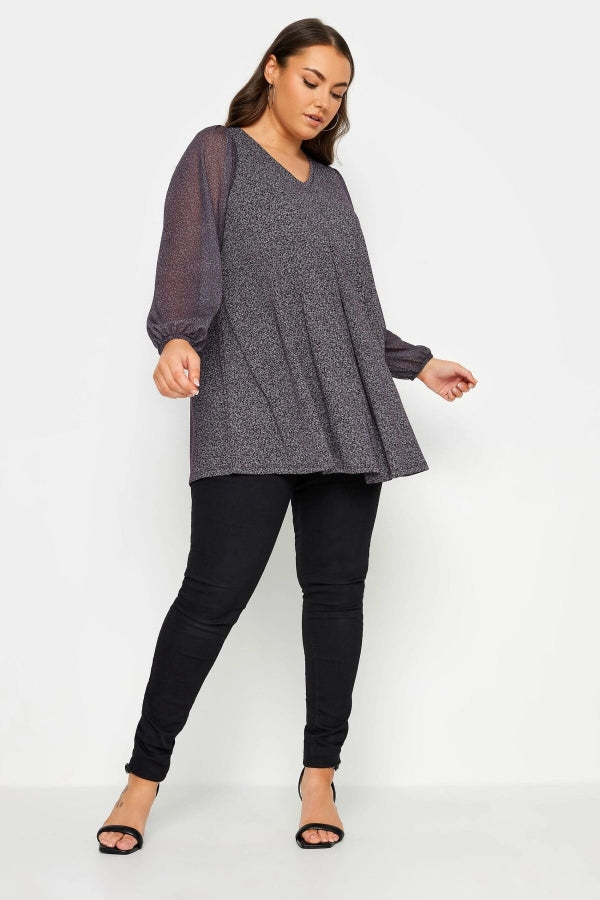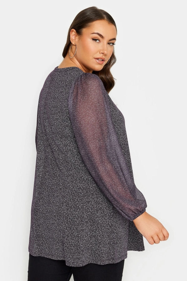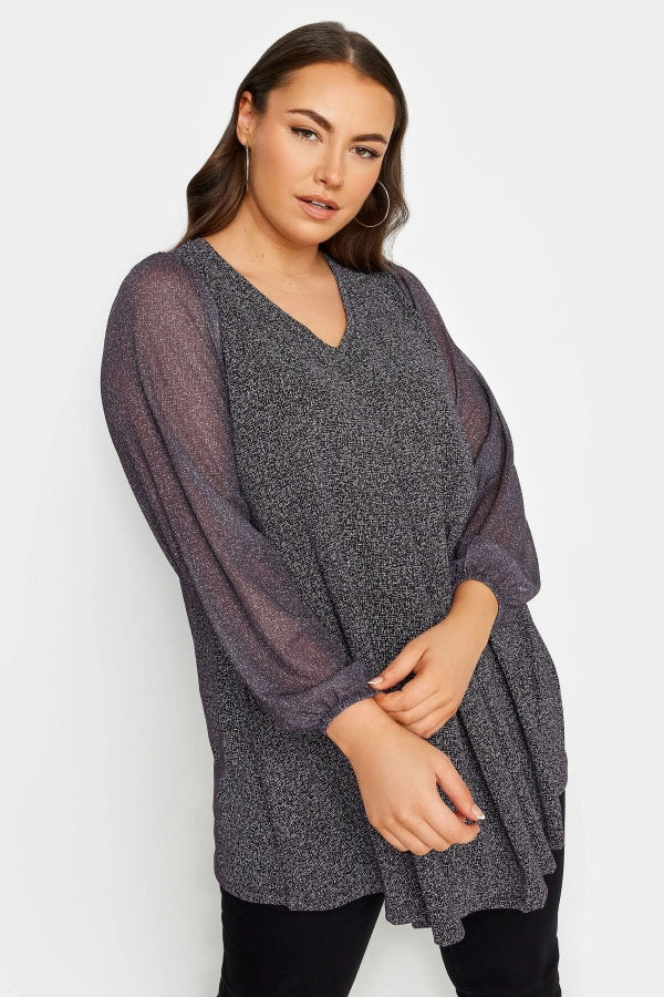 Büyük Beden Uzun Kolları Tül Detaylı Pileli V Yaka Bluz 302828