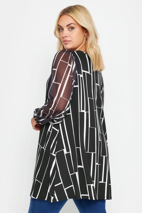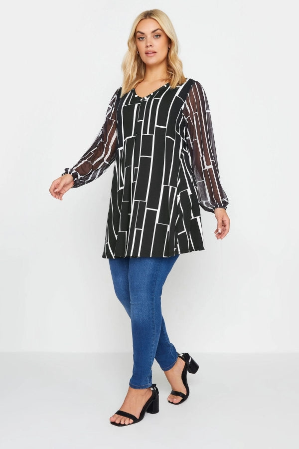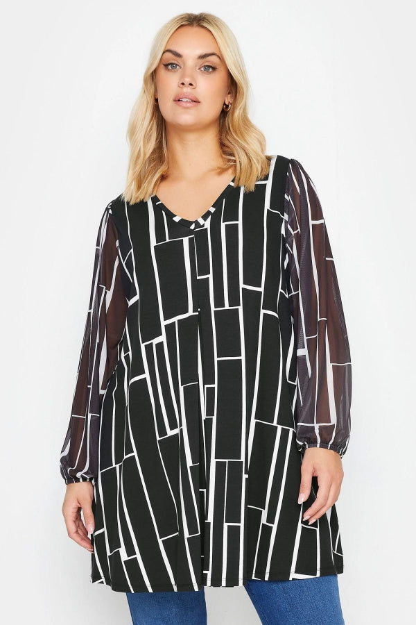 Büyük Beden Uzun Kolları Tül Detaylı Pileli V Yaka Bluz 303055