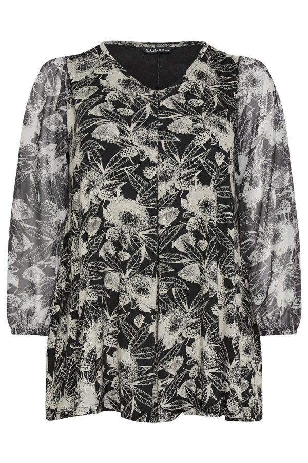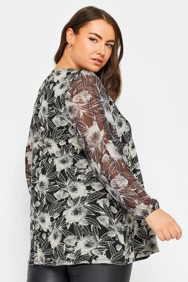 Büyük Beden Uzun Kolları Tül Detaylı Pileli V Yaka Bluz 303115