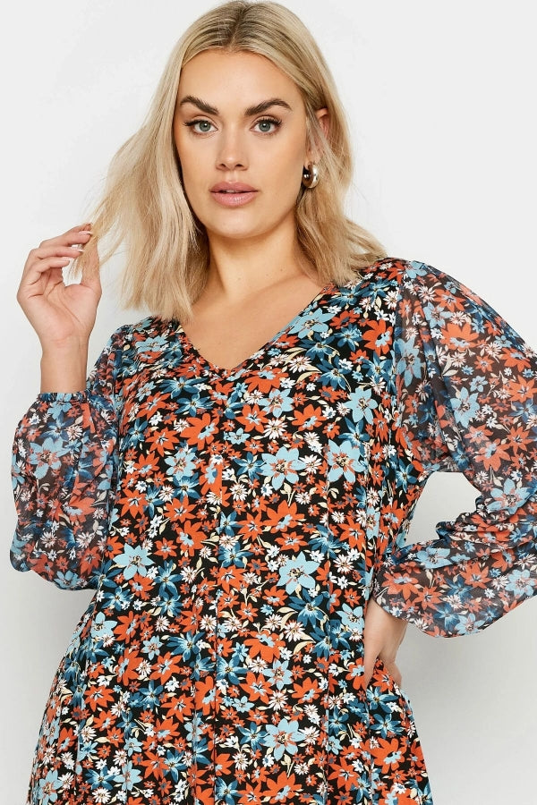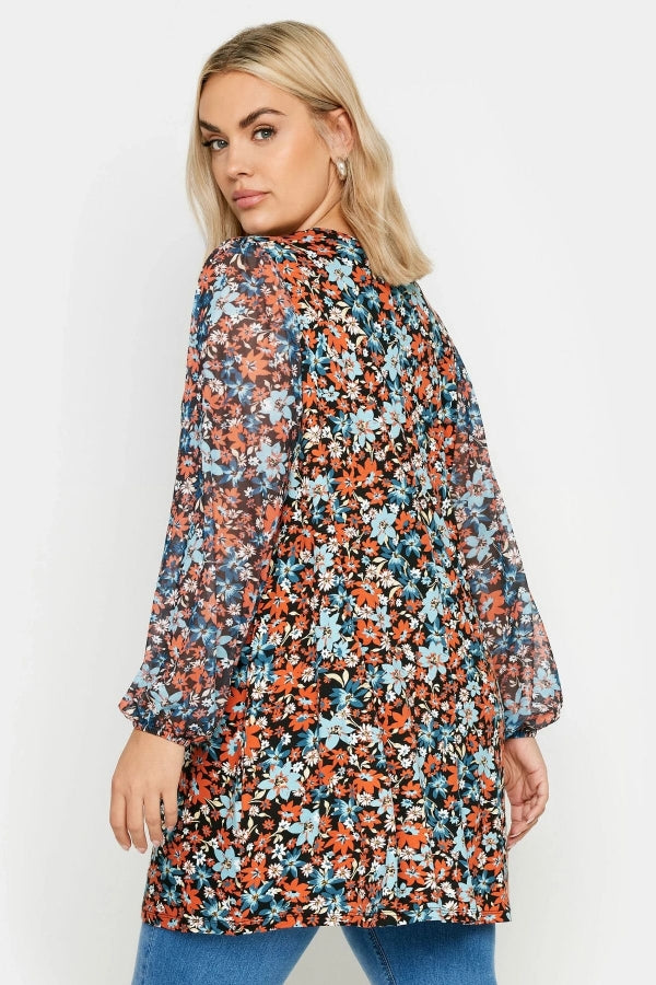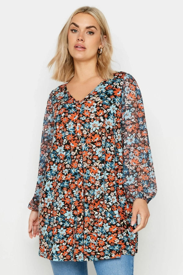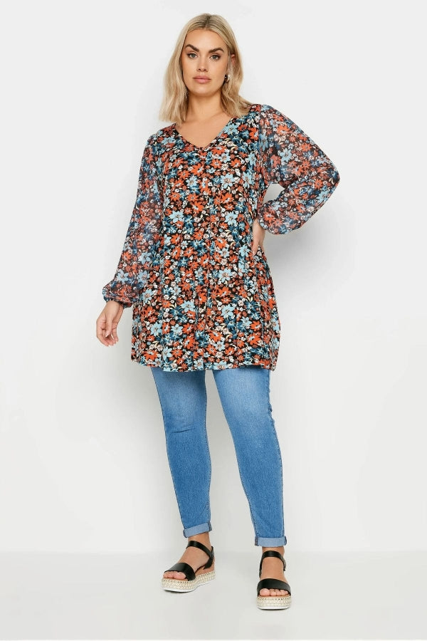 Büyük Beden Uzun Kolları Tül Detaylı Pileli V Yaka Bluz 303116