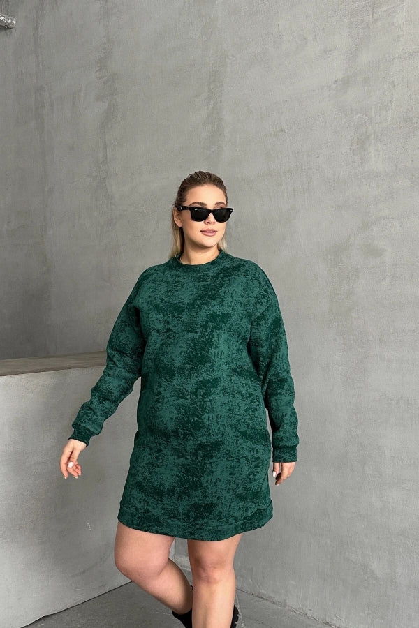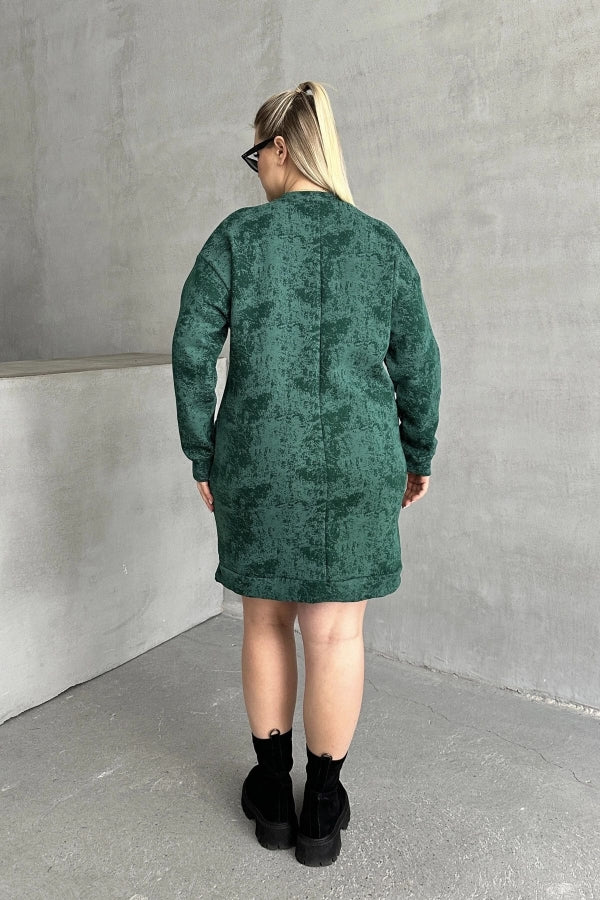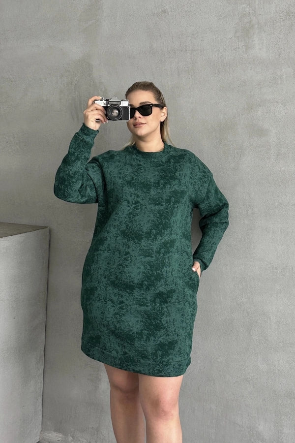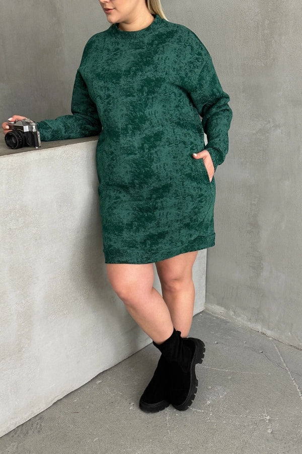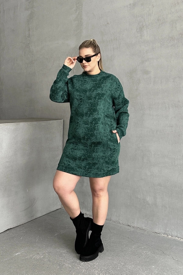 Büyük Beden Uzun Kollu Bisiklet Yaka Cepli Desenli Elbise 106-77