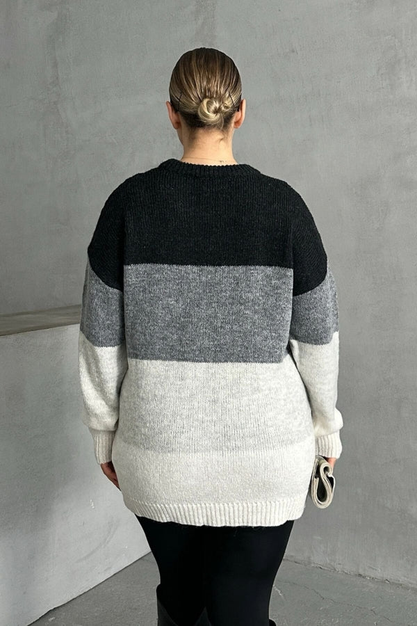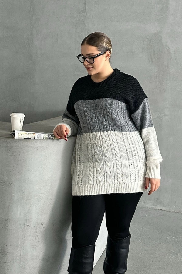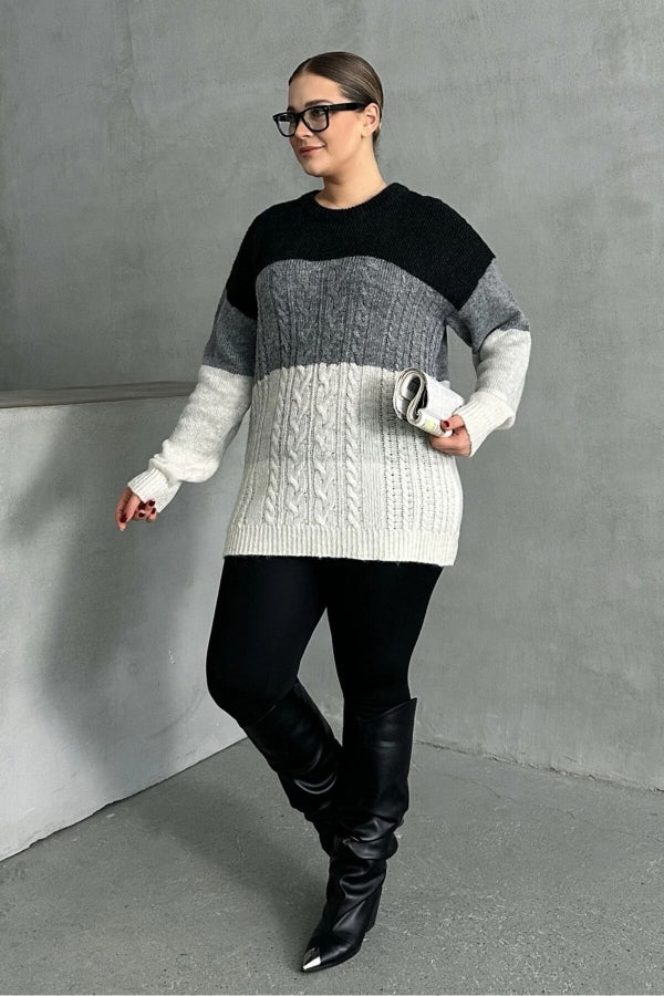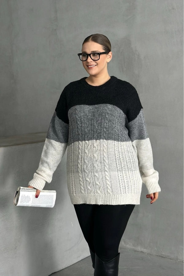 Büyük Beden Uzun Kollu Bisiklet Yaka Renk Bloklu Triko Kazak DG-04