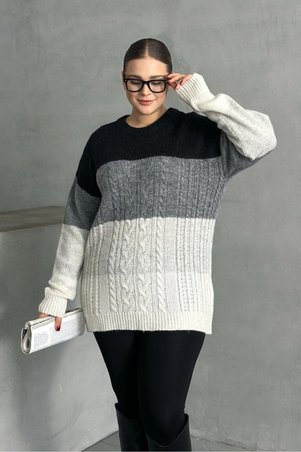 Büyük Beden Uzun Kollu Bisiklet Yaka Renk Bloklu Triko Kazak DG-04