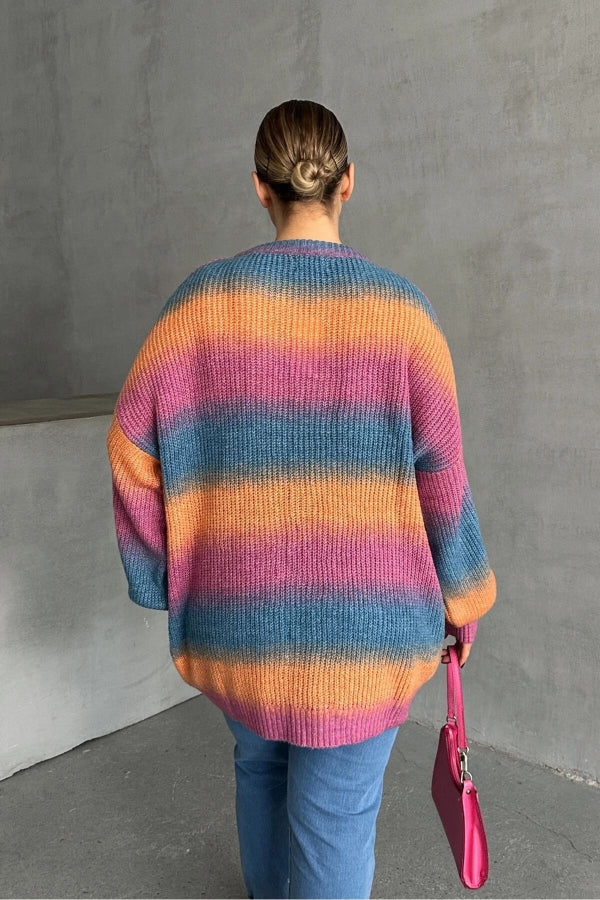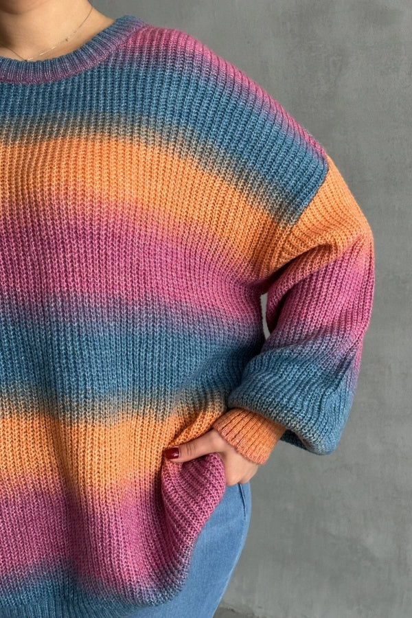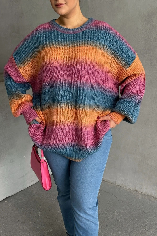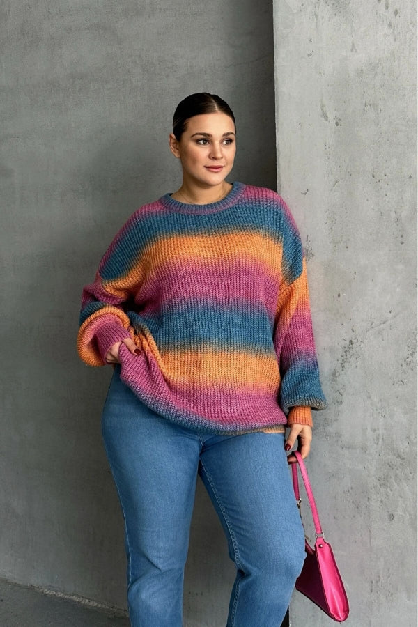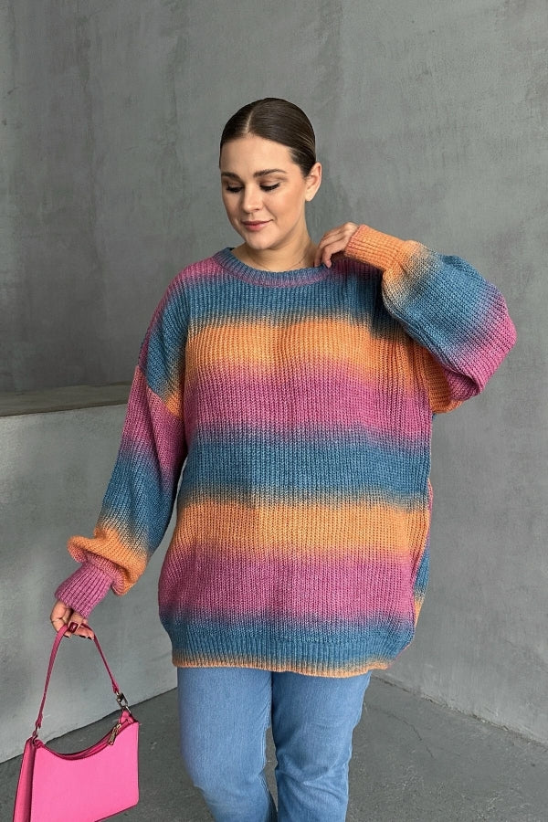 Büyük Beden Uzun Kollu Bisiklet Yaka Renk Bloklu Triko Kazak DG-09