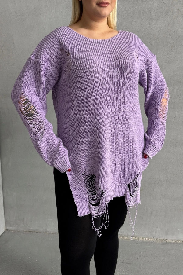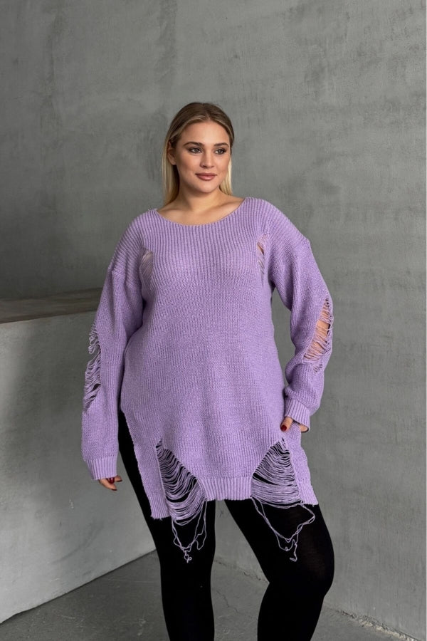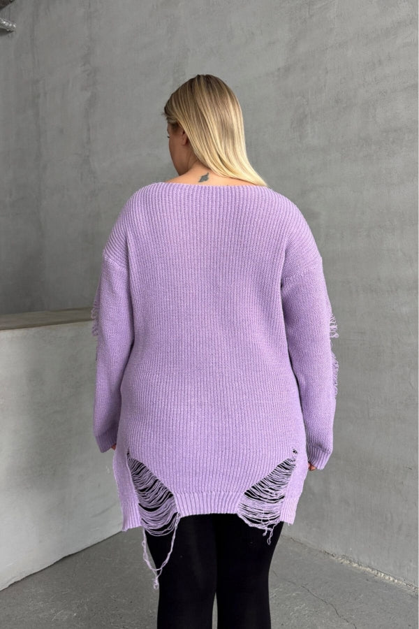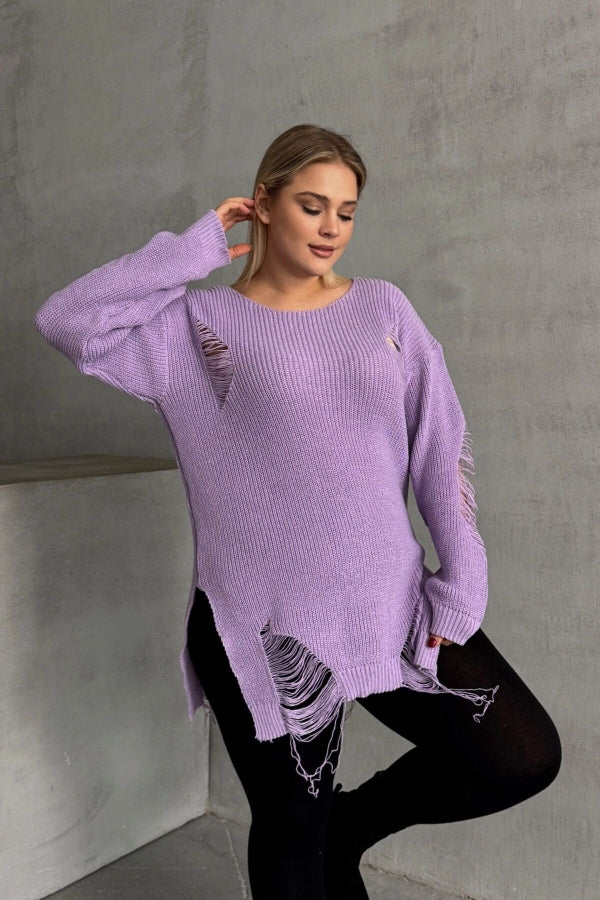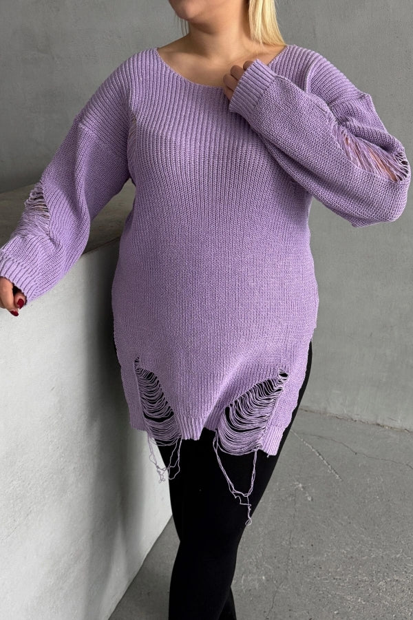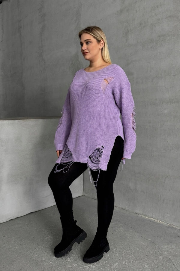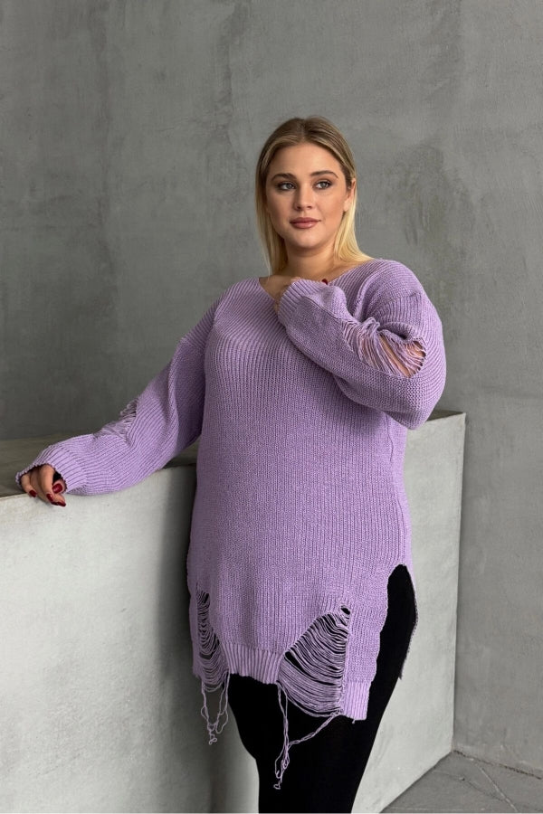 Büyük Beden Uzun Kollu Bisiklet Yaka Yırtık Detaylı Triko Kazak T-3