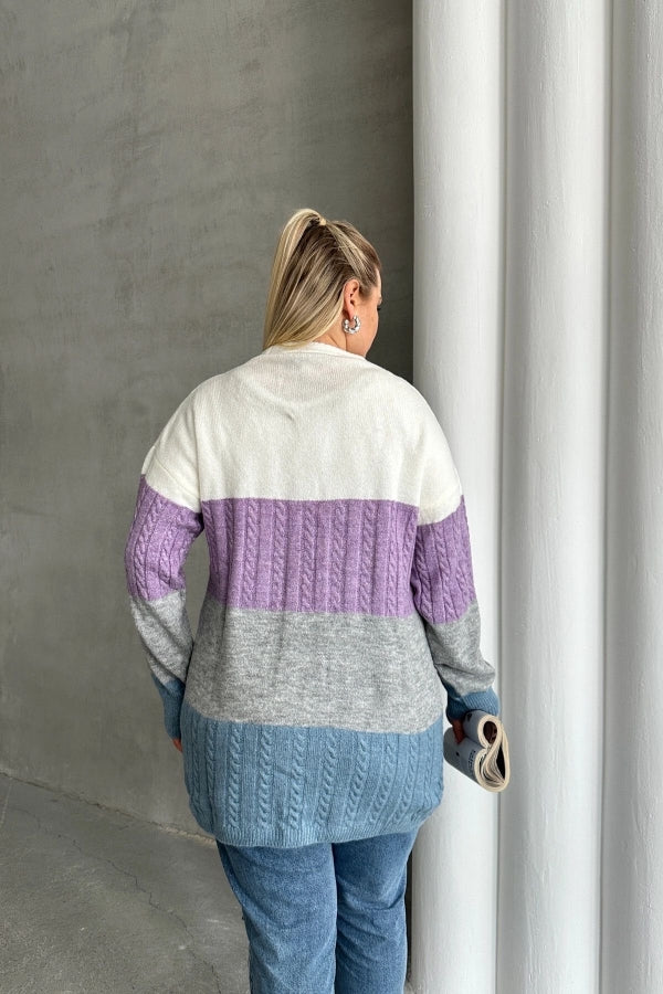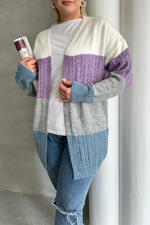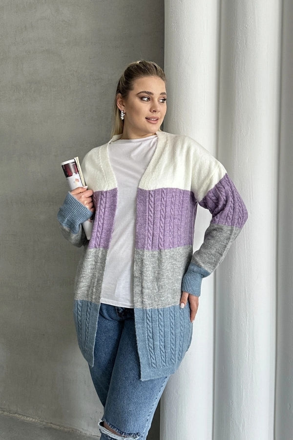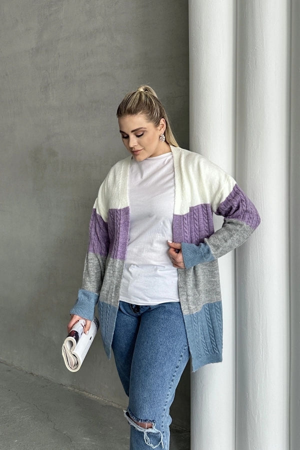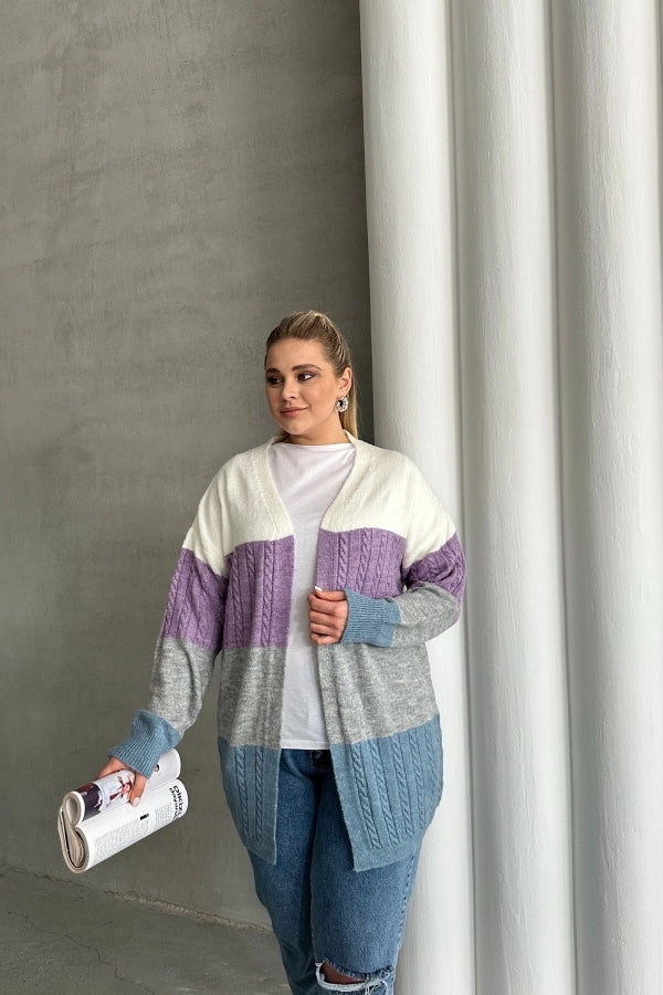 Büyük Beden Uzun Kollu Önü Kapamasız Renk Bloklu Triko Hırka 302148