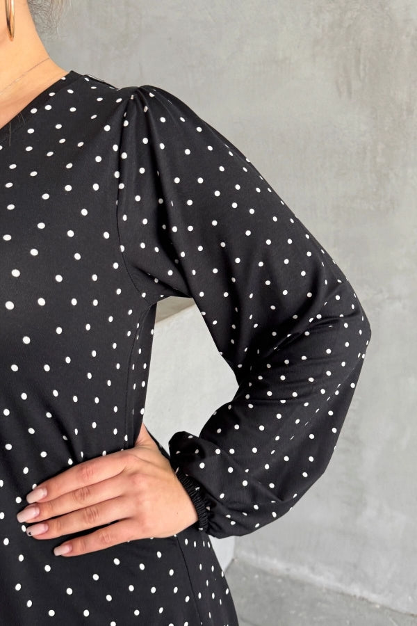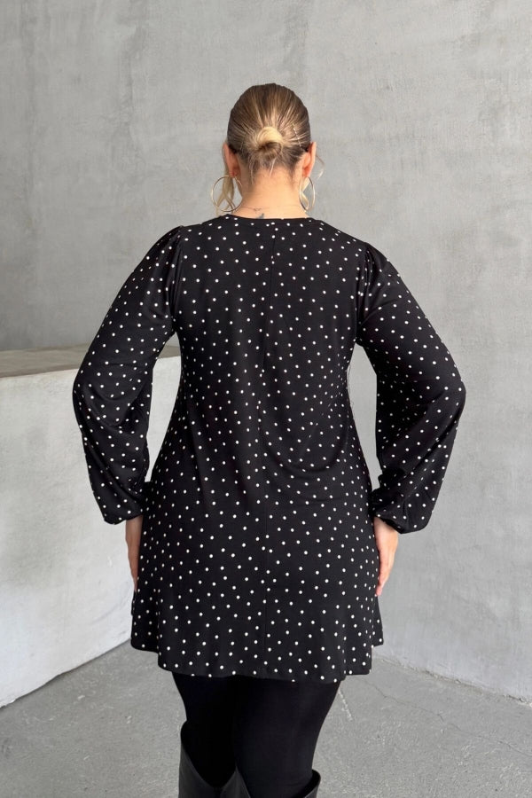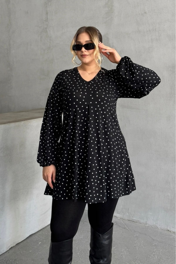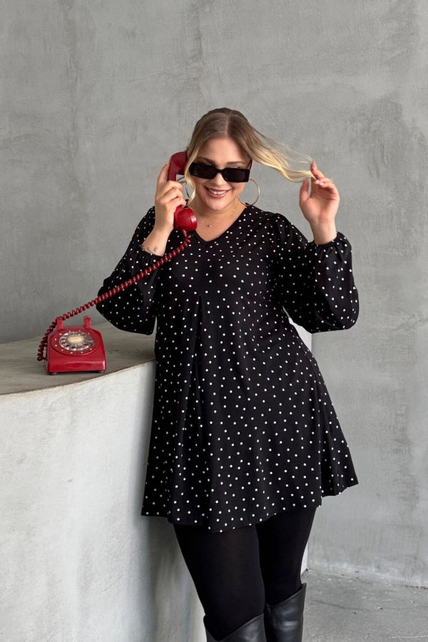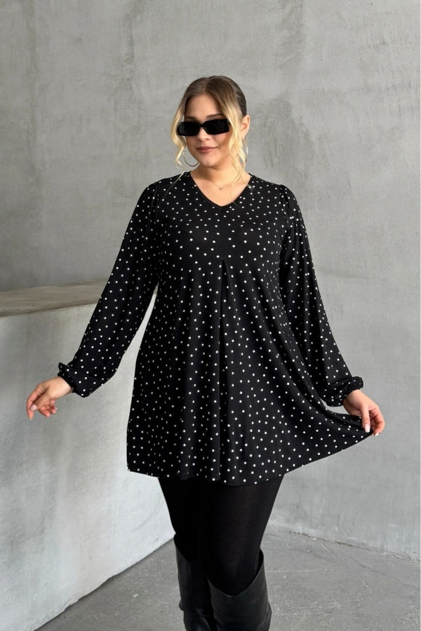Büyük Beden Uzun Kollu Önü Pileli Bilekleri Lastikli Puantiyeli Bluz 322348