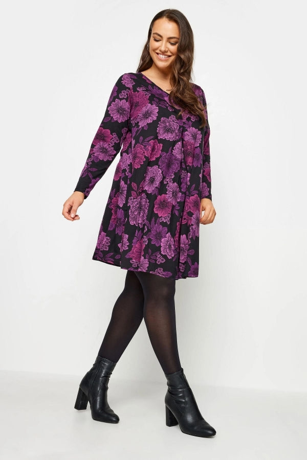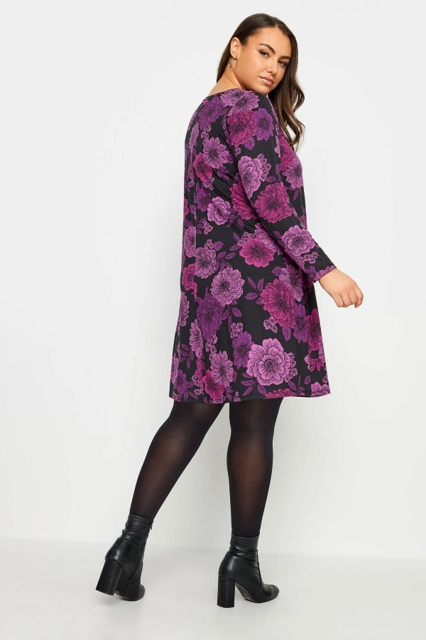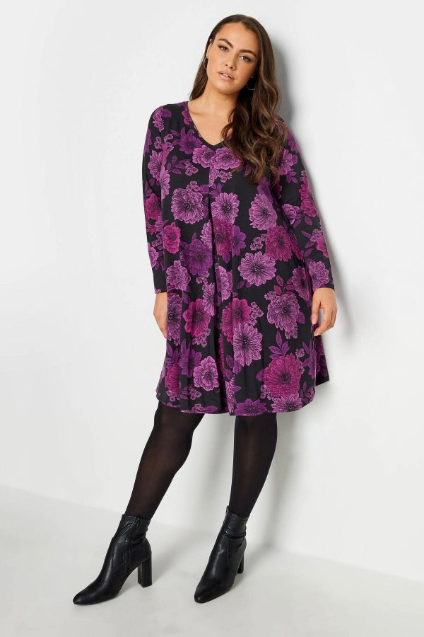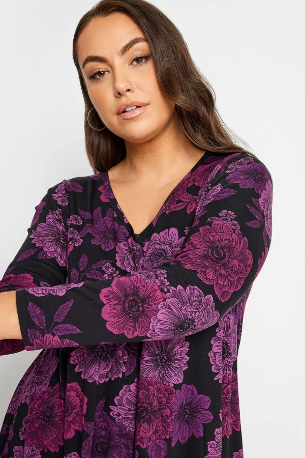 Büyük Beden Uzun Kollu V Yaka Çiçek Desenli Elbise 302765