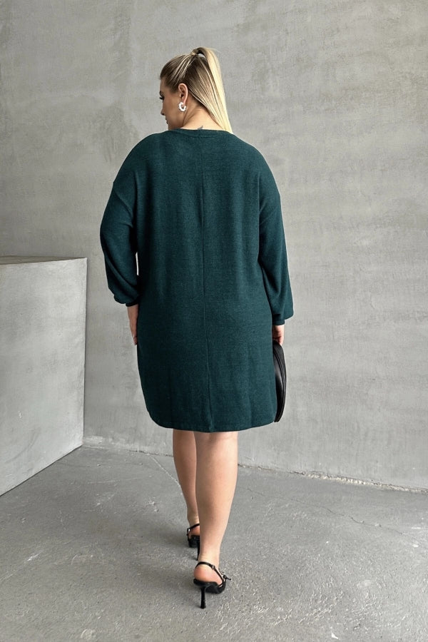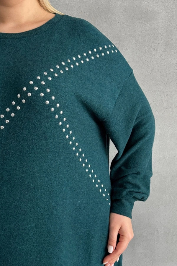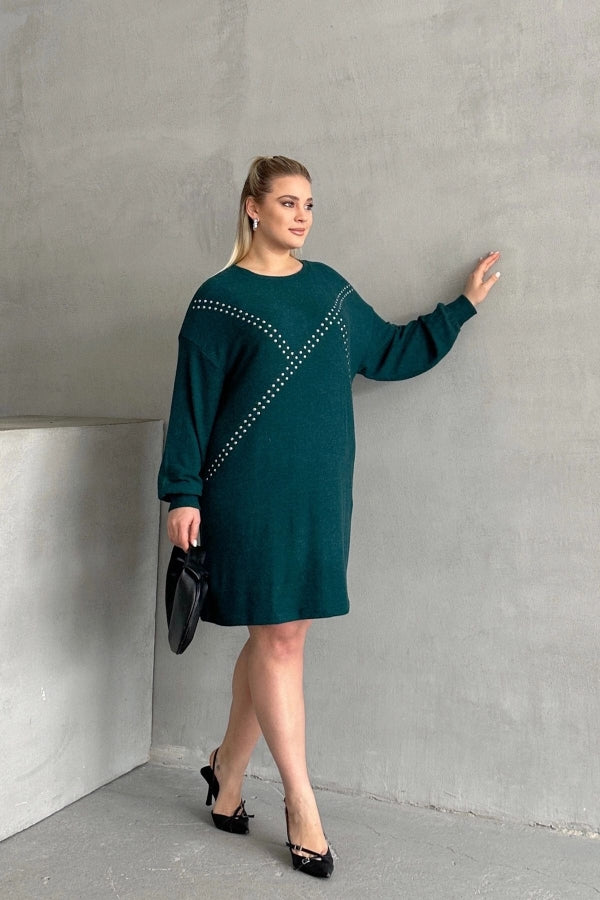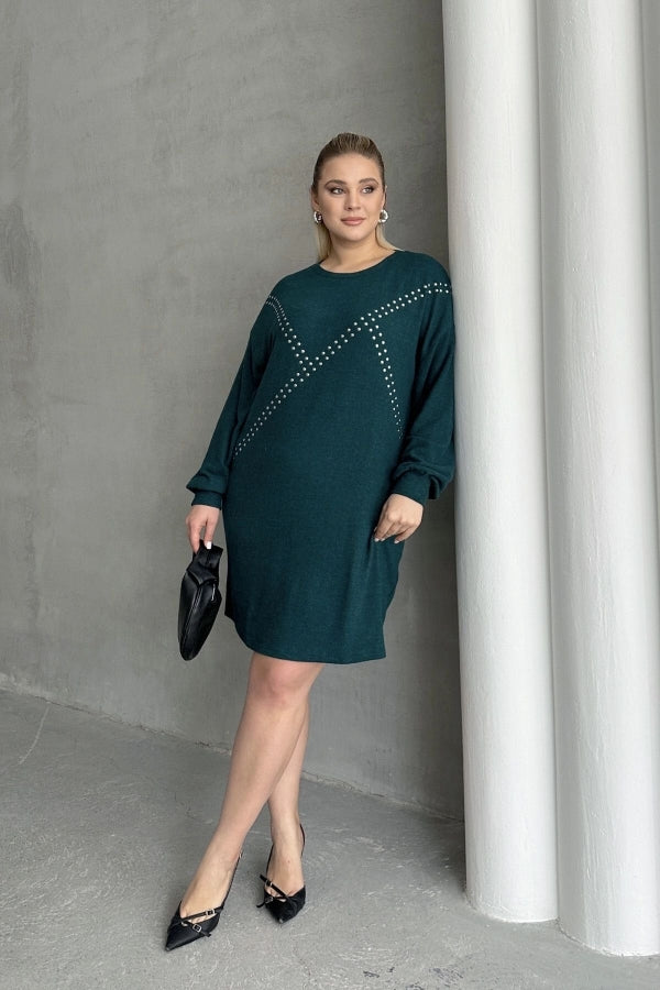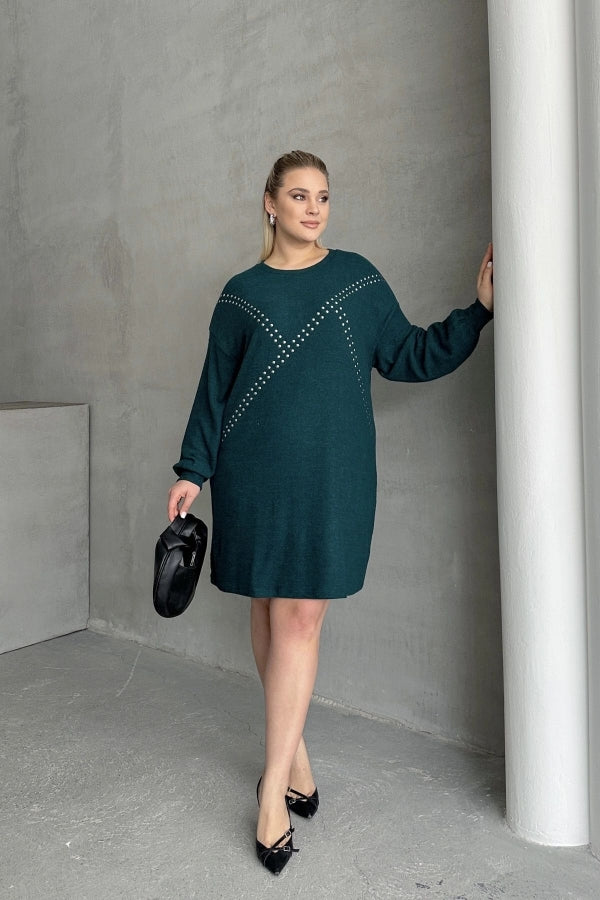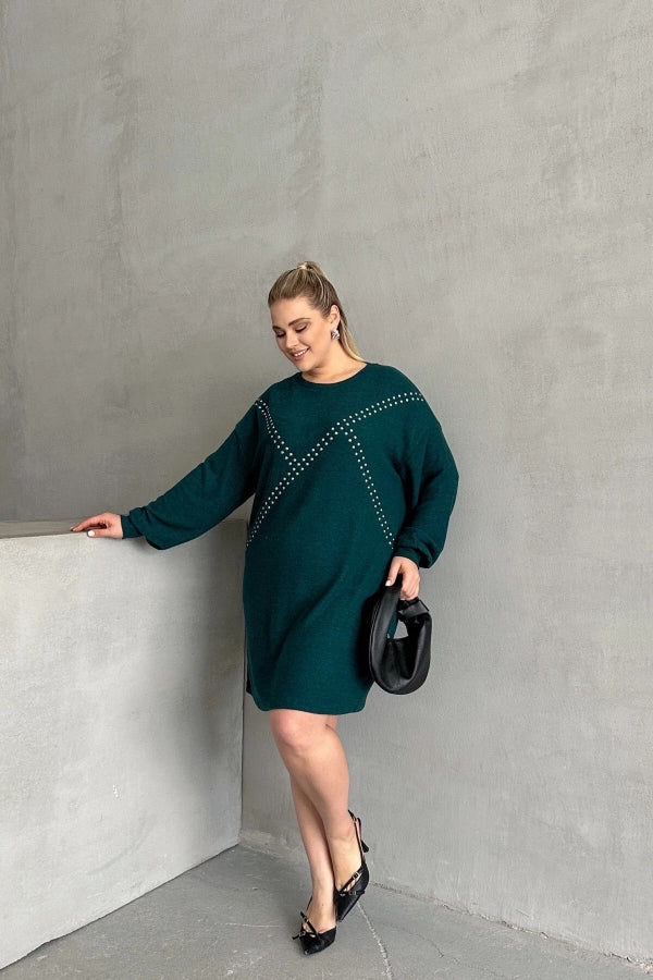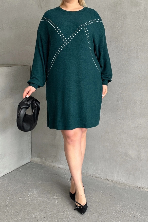 Büyük Beden Uzun Kollu Yumuşak Dokulu Taş İşlemeli Triko Elbise 285040