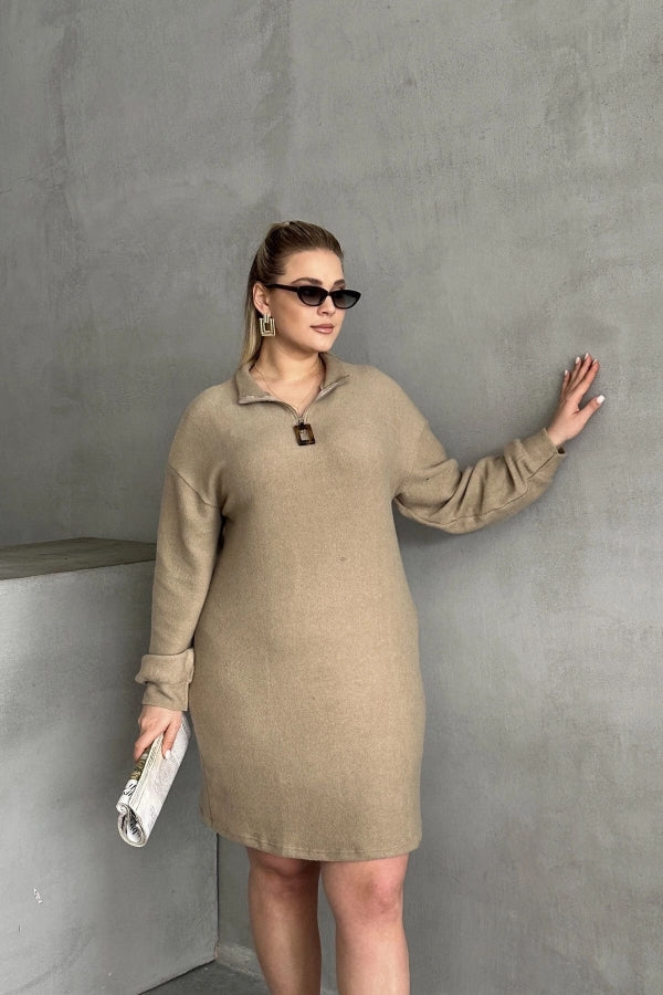 Büyük Beden Uzun Kollu Yumuşak Dokulu Yakası Fermuarlı Triko Elbise 106-37