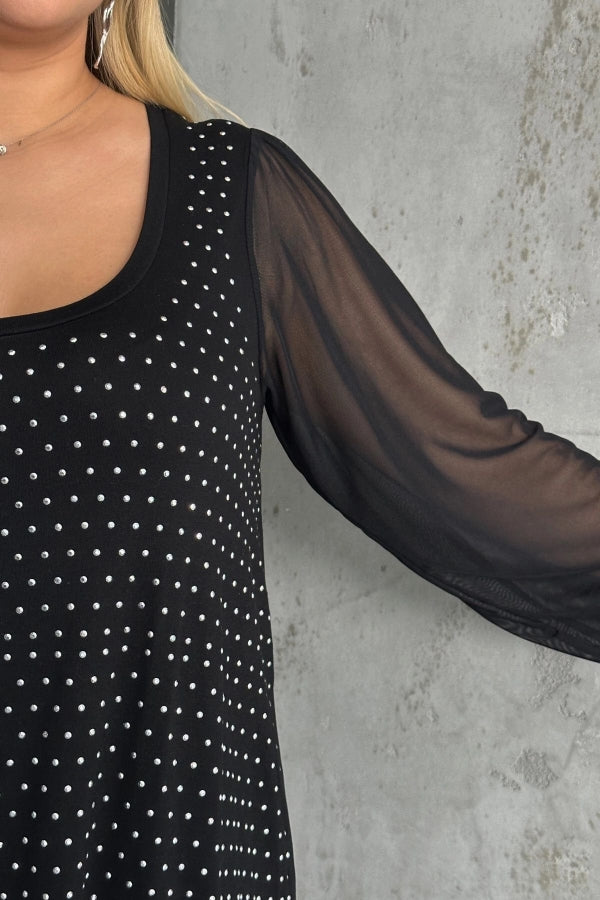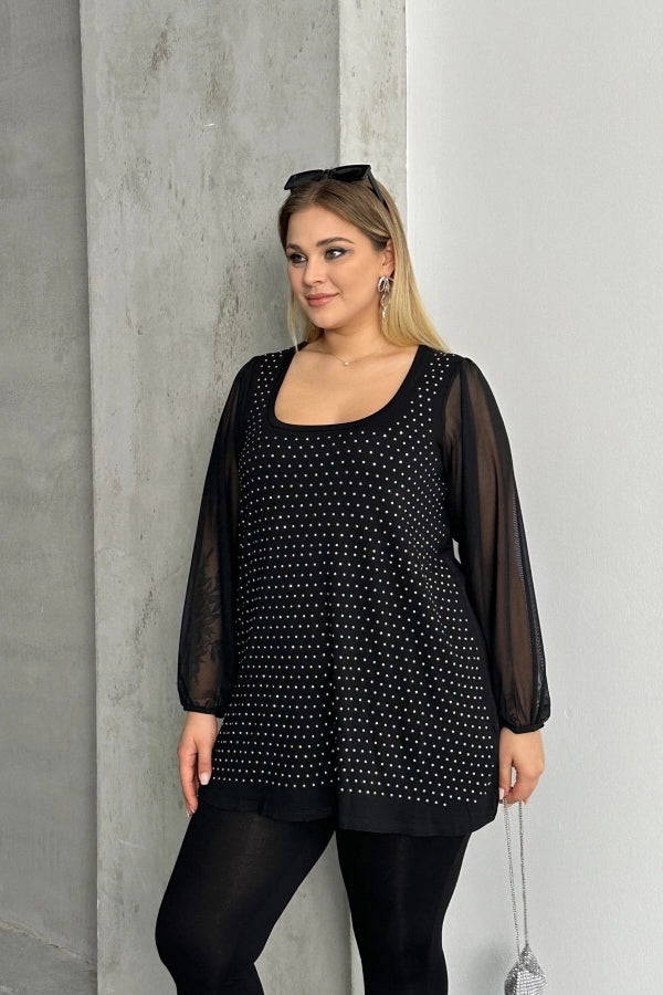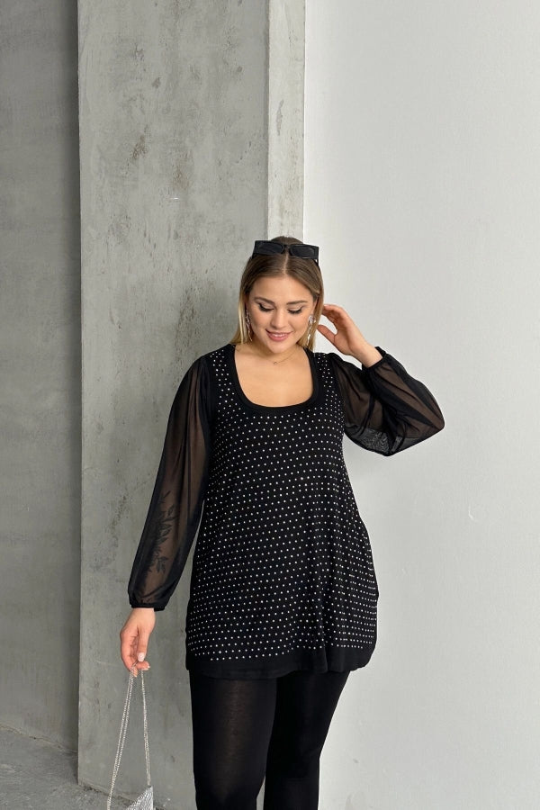 Büyük Beden Uzun Tül Kol Önü Taş İşlemeli Bisiklet Yaka Bluz 321831-U