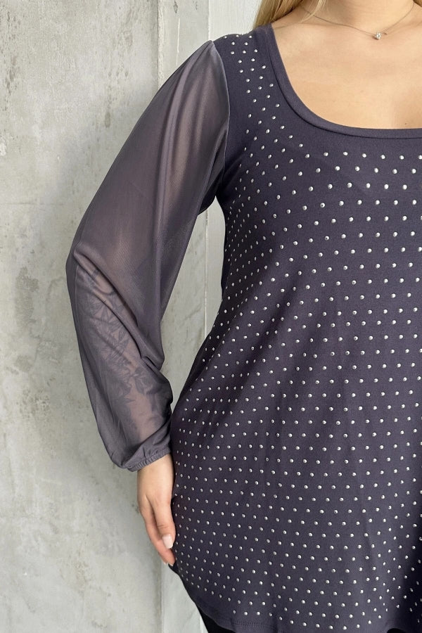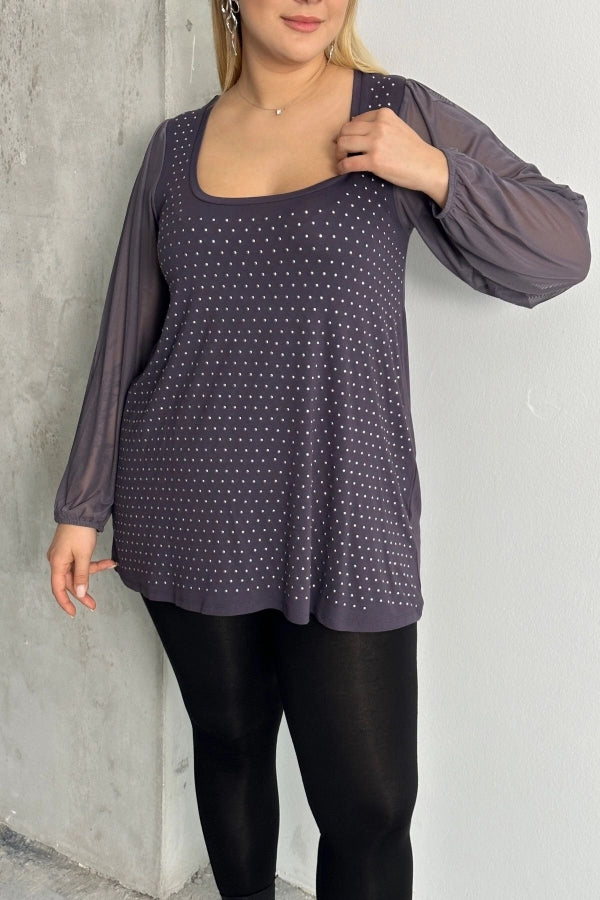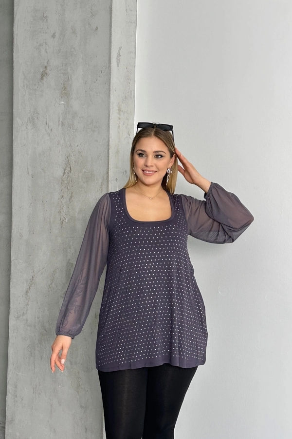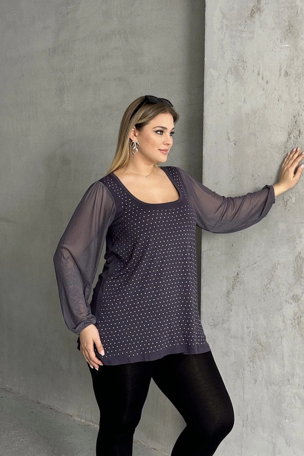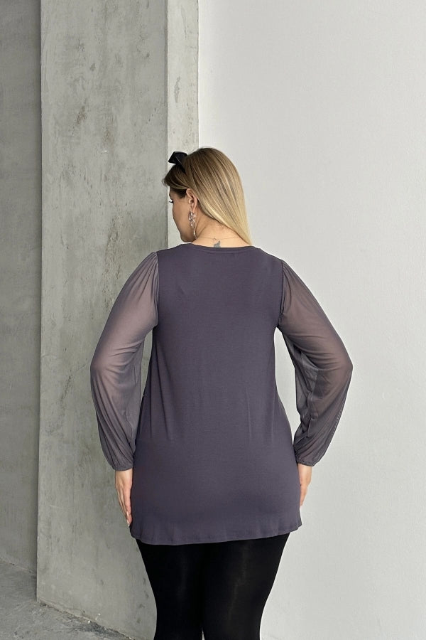 Büyük Beden Uzun Tül Kol Önü Taş İşlemeli Bisiklet Yaka Bluz 321850-U