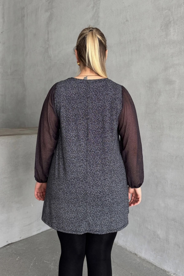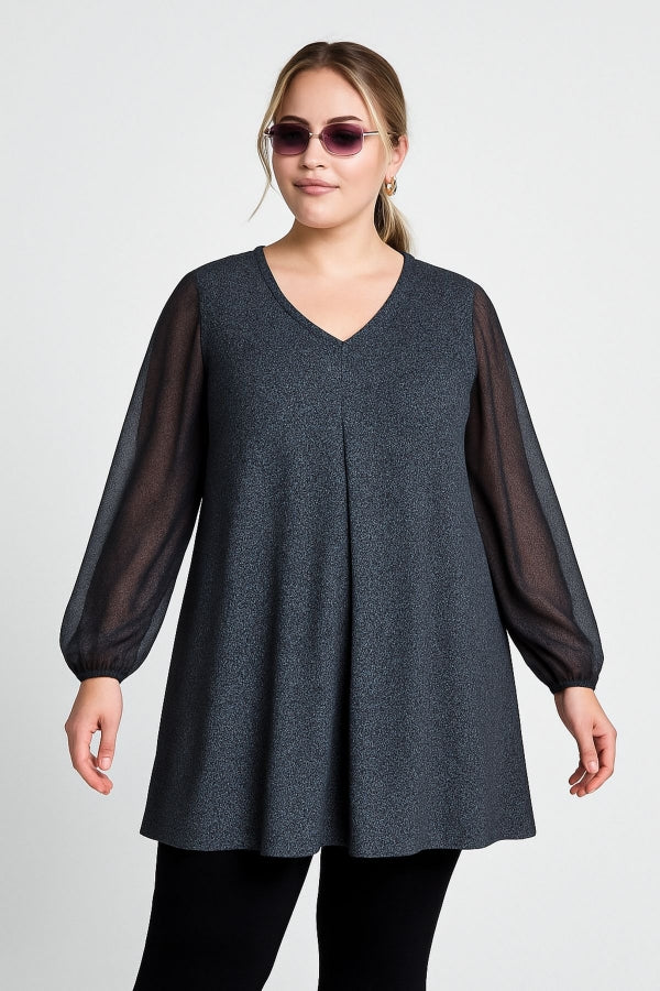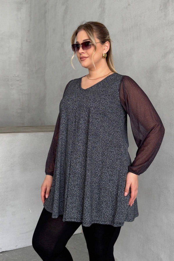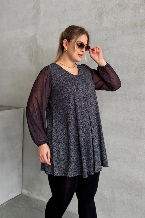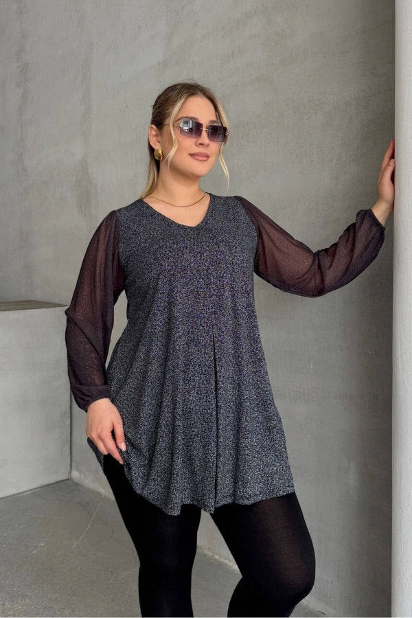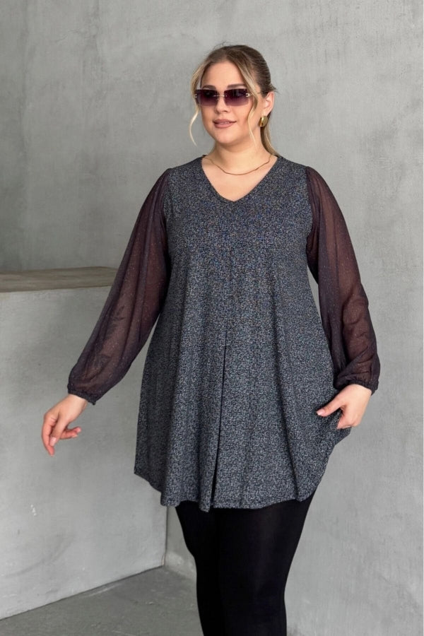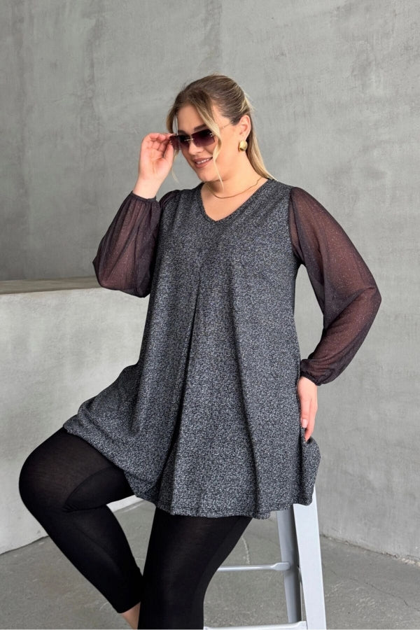 Büyük Beden Uzun Tül Kol V Yaka Bilekleri Lastikli Simli Bluz 78-132