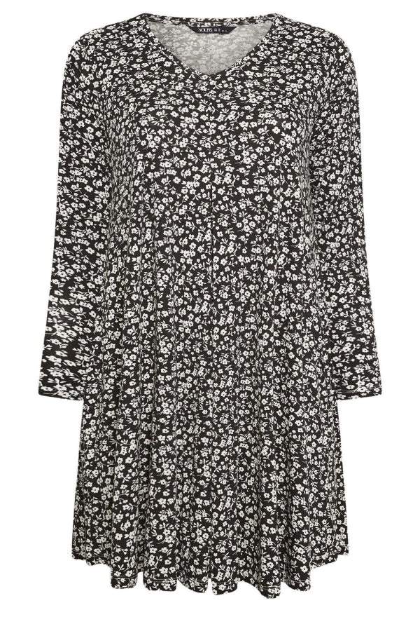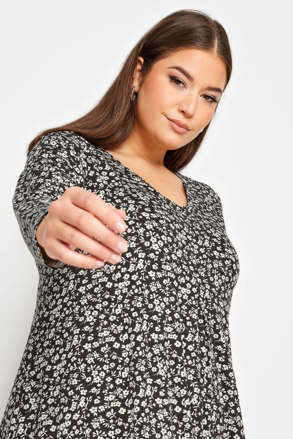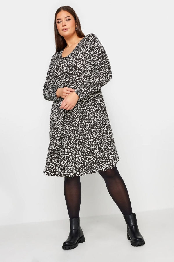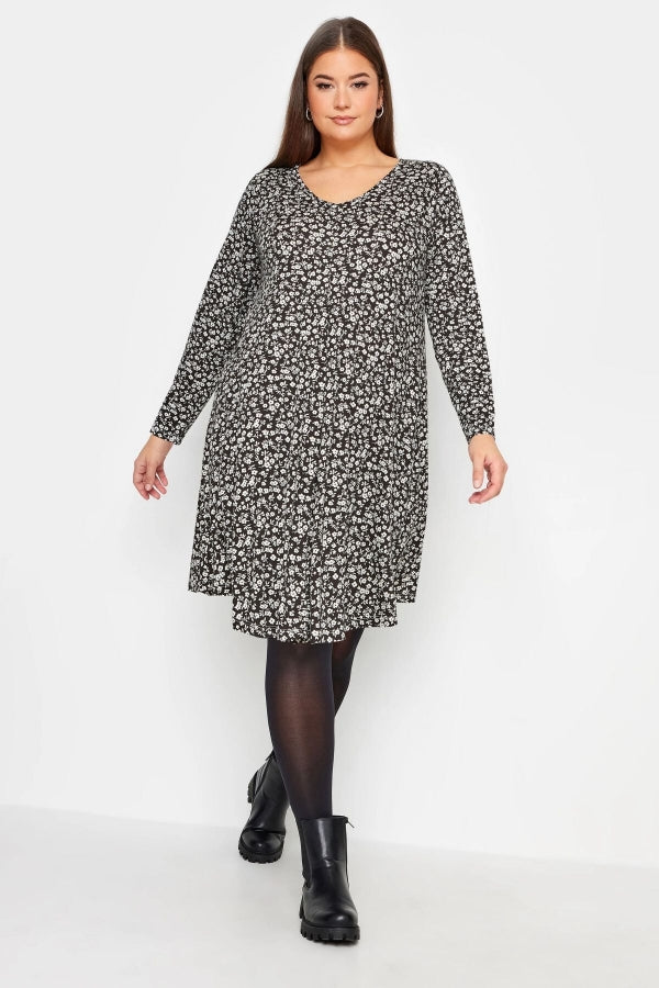 Büyük Beden V Yaka Çiçek Desenli Uzun Kollu Kısa Elbise 302740