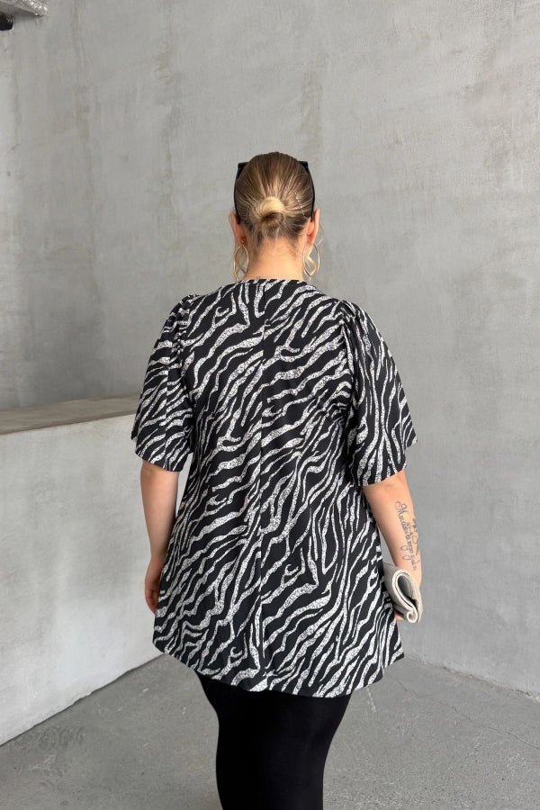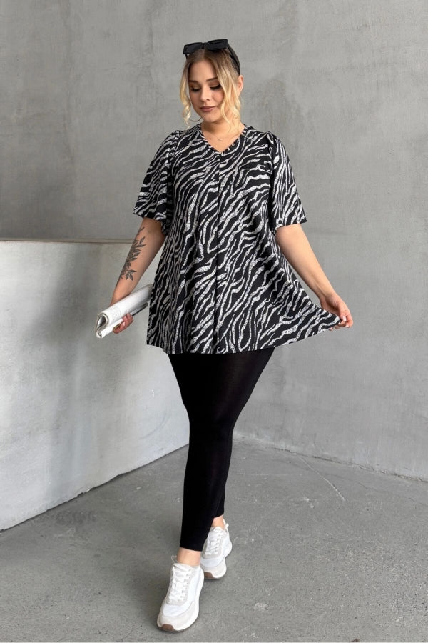 Büyük Beden V Yaka Desenli Asimetrik Kesim Likralı Bluz 302674