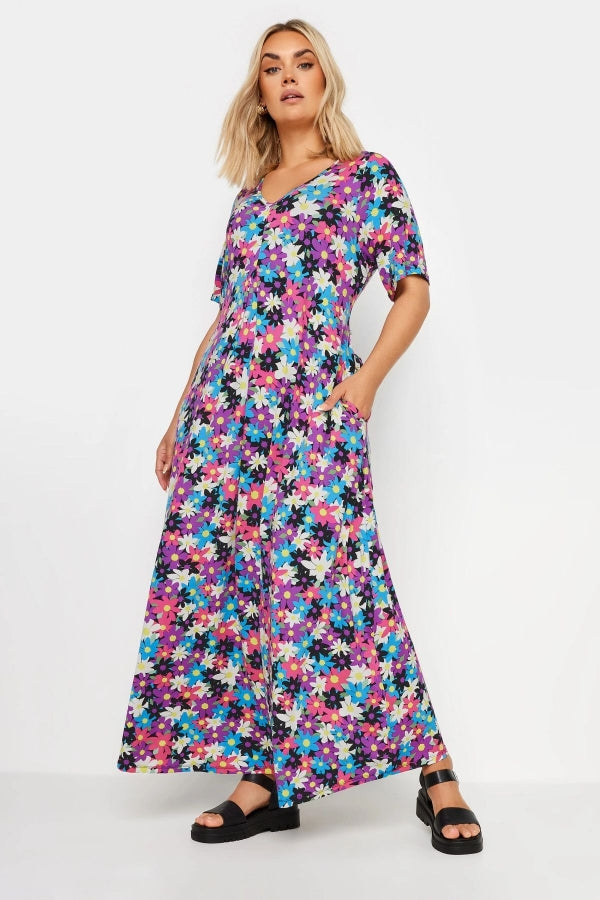 Büyük Beden V Yaka Desenli Kısa Kollu Cepli Uzun Elbise 137863
