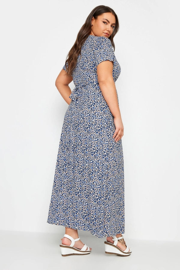 Büyük Beden V Yaka Desenli Kuşaklı Kısa Kol Anvelop Elbise 302644