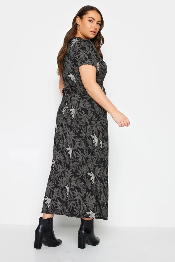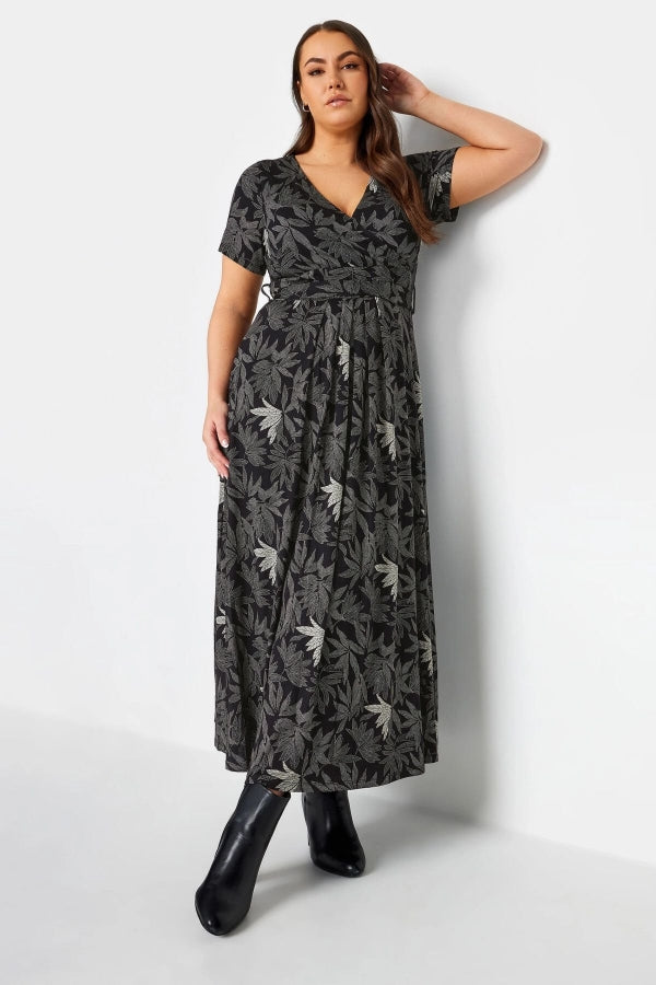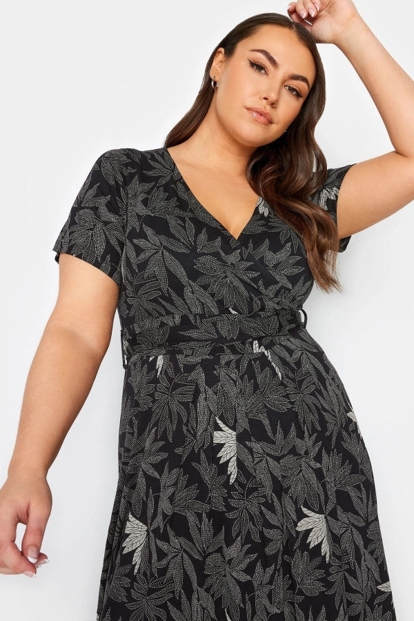 Büyük Beden V Yaka Desenli Kuşaklı Kısa Kol Anvelop Elbise 302694
