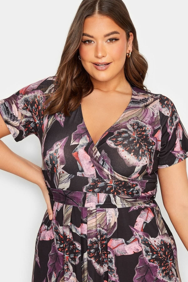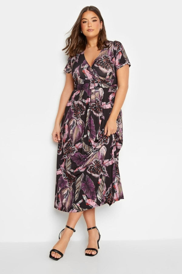 Büyük Beden V Yaka Desenli Kuşaklı Likralı Yarım Kol Anvelop Elbise 301989