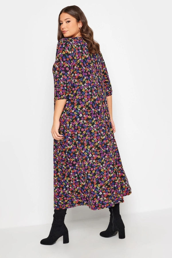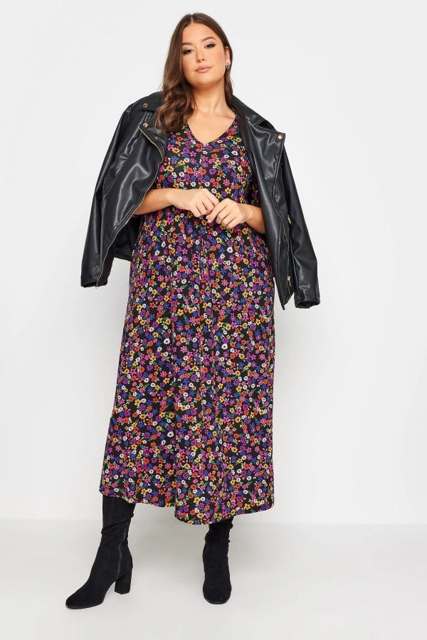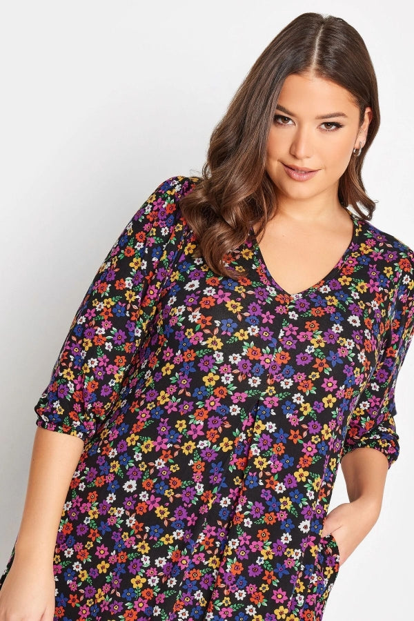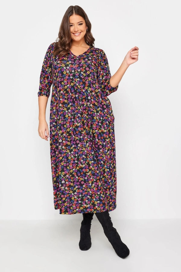 Büyük Beden V Yaka Desenli Yarım Kollu Cepli Elbise 302743