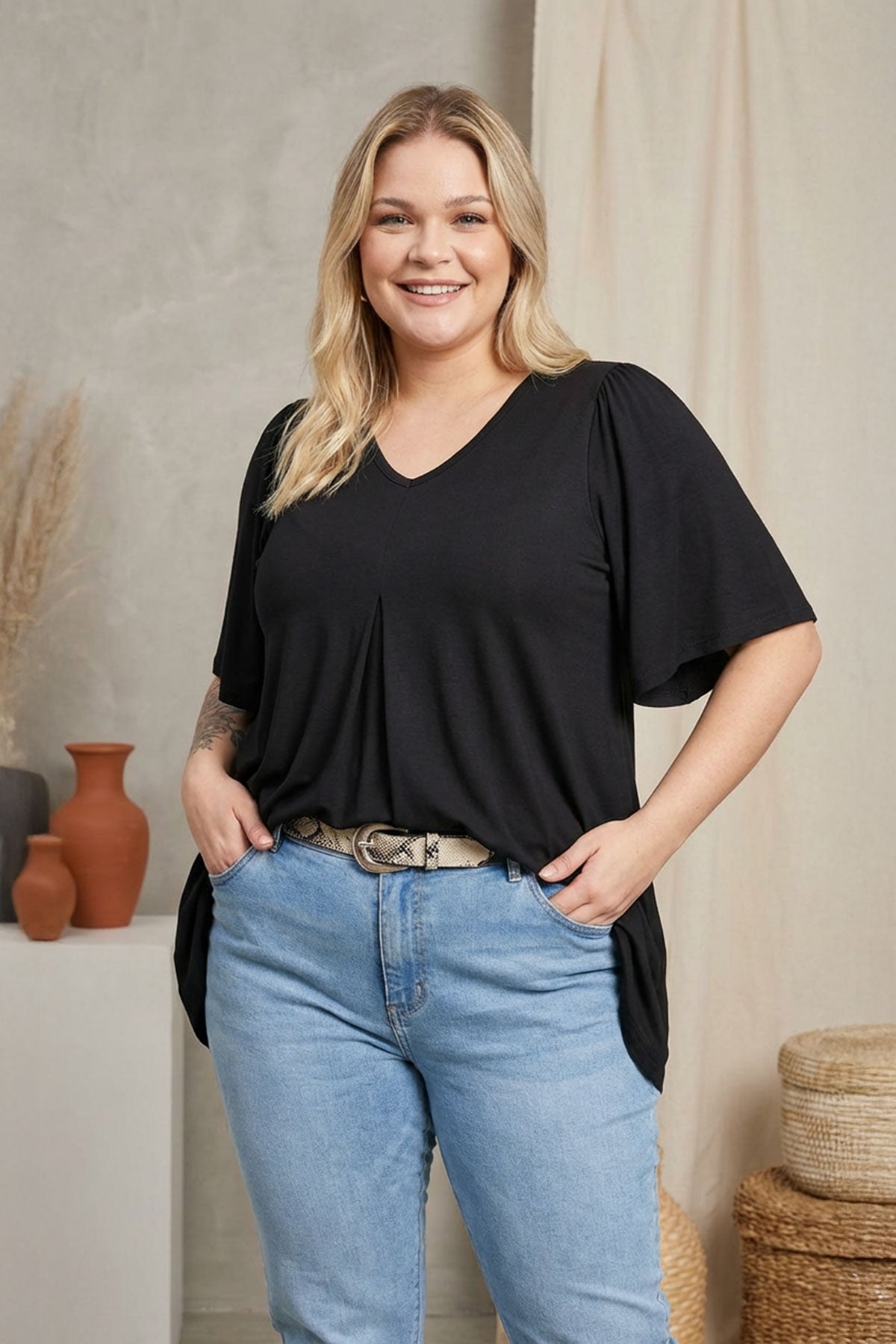 Büyük beden V yaka bluz, şıklığı ve rahatlığı bir arada sunuyor! Asimetrik kesimi ve likralı yapısı sayesinde gün boyu konfor sağlar. Önü pileli ve kısa melek kol detaylarıyla, salaş bir görünüm elde etmek isteyenler için ideal bir parça. Hem gündelik hayatta hem de özel davetlerde kombinlerinize zarafet katar.