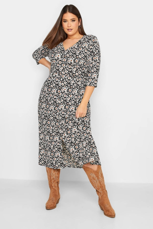 Büyük Beden V Yaka Fakir Kol Çiçek Desenli Midi Boy Elbise 301865