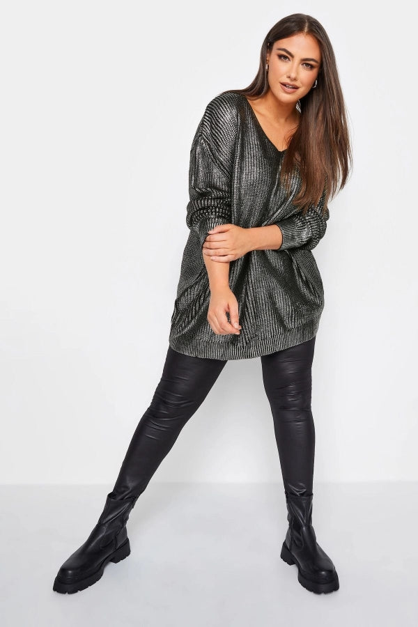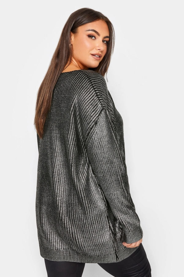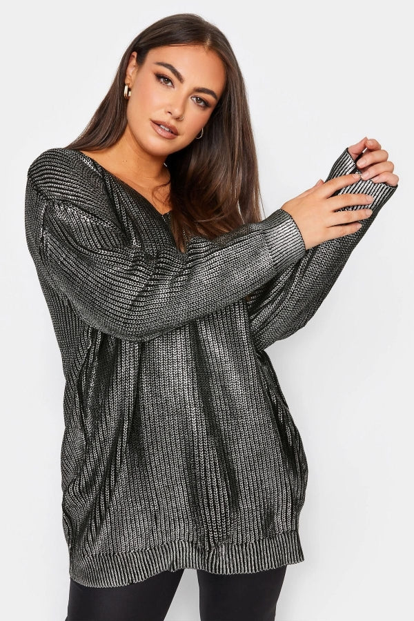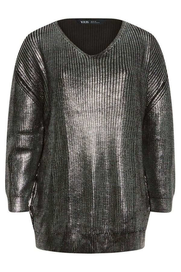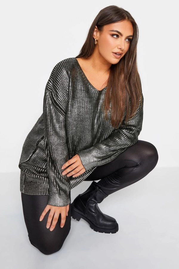 Büyük Beden V Yaka Folyo Baskılı Uzun Kollu Kazak 302321