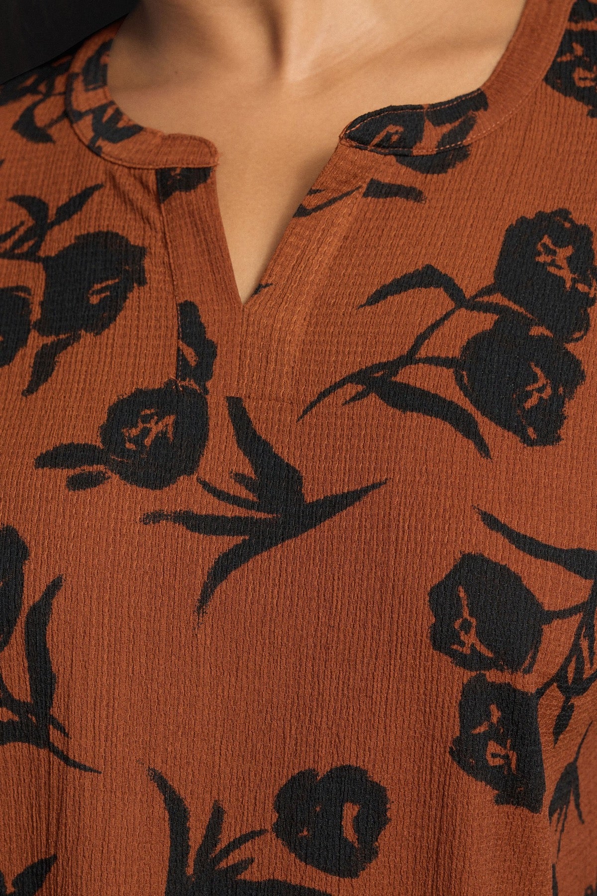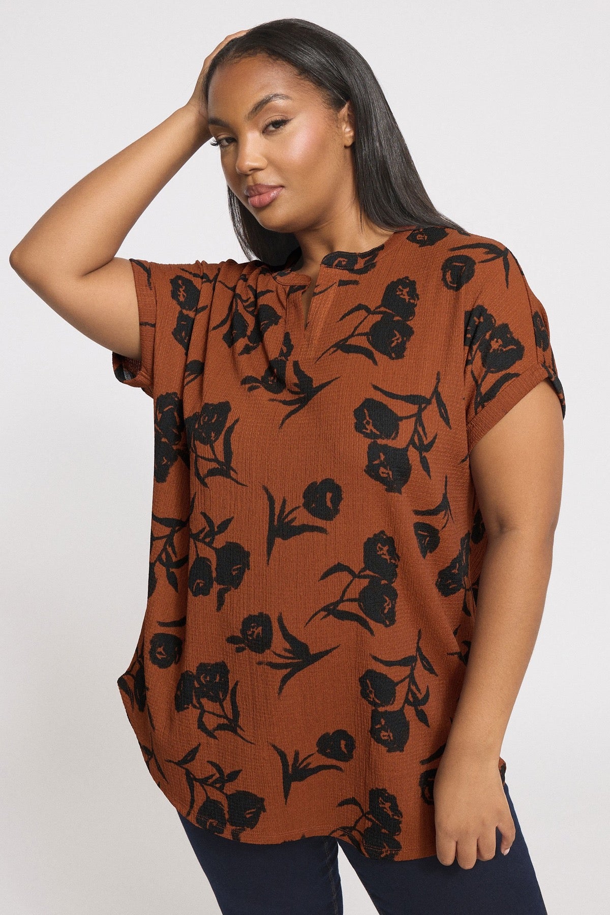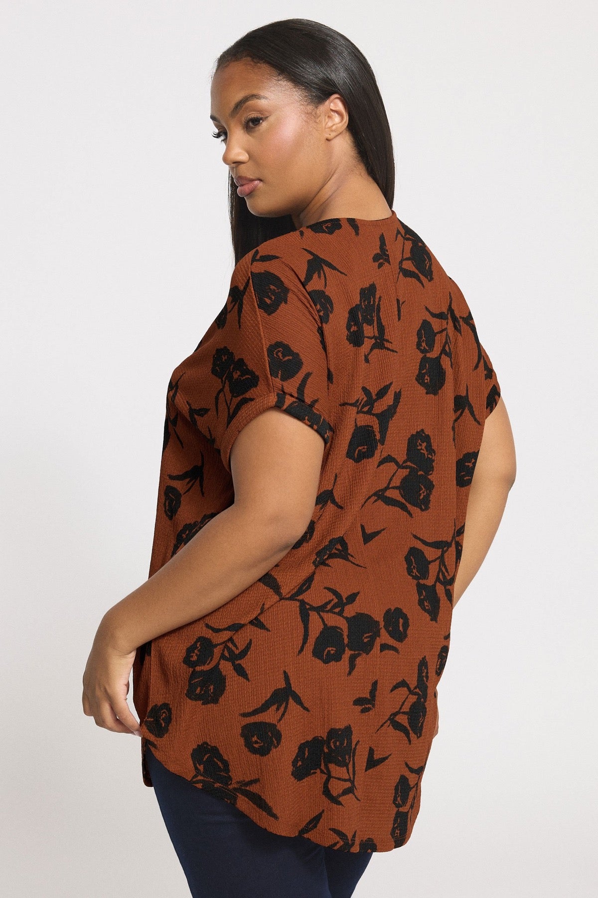 Büyük Beden V Yaka Kısa Kollu Bürümcük Kumaş Çiçek Baskılı T-shirt 304313