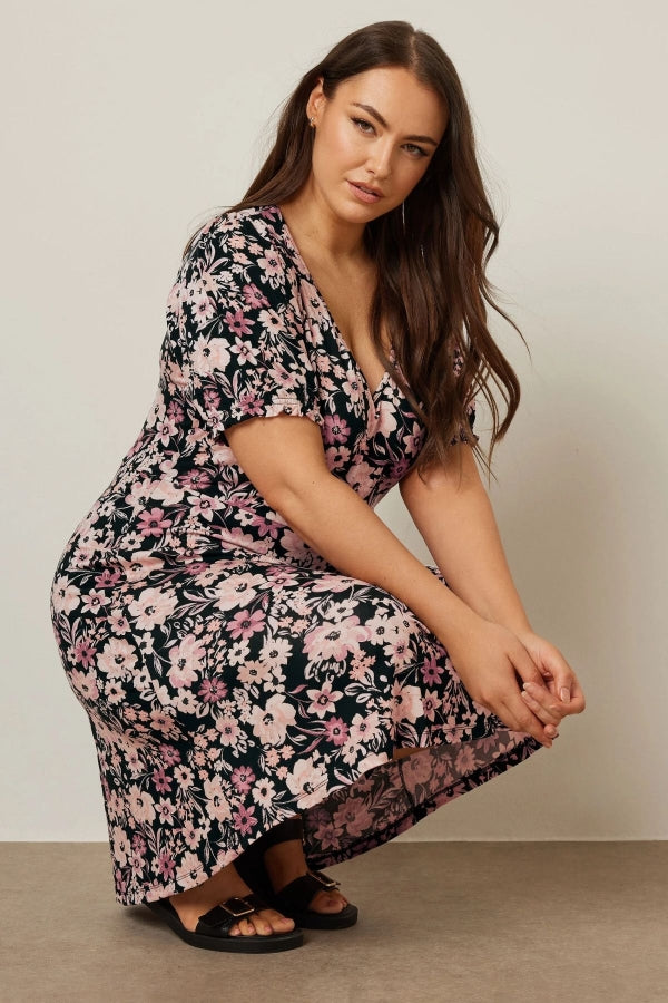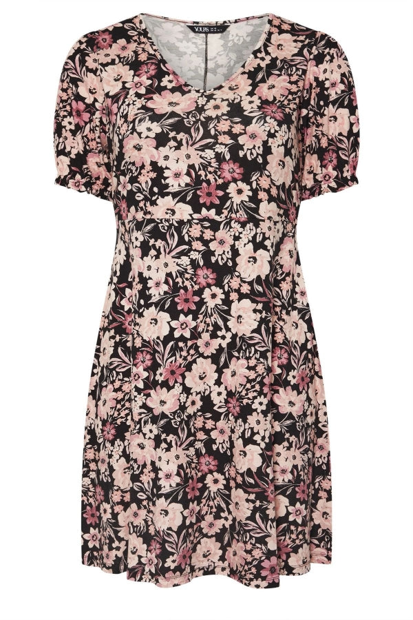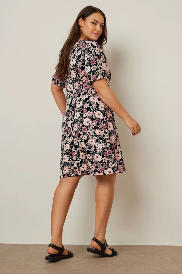 Büyük Beden V Yaka Kısa Kollu Çiçek Desenli Mini Elbise 137983