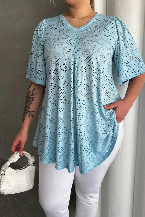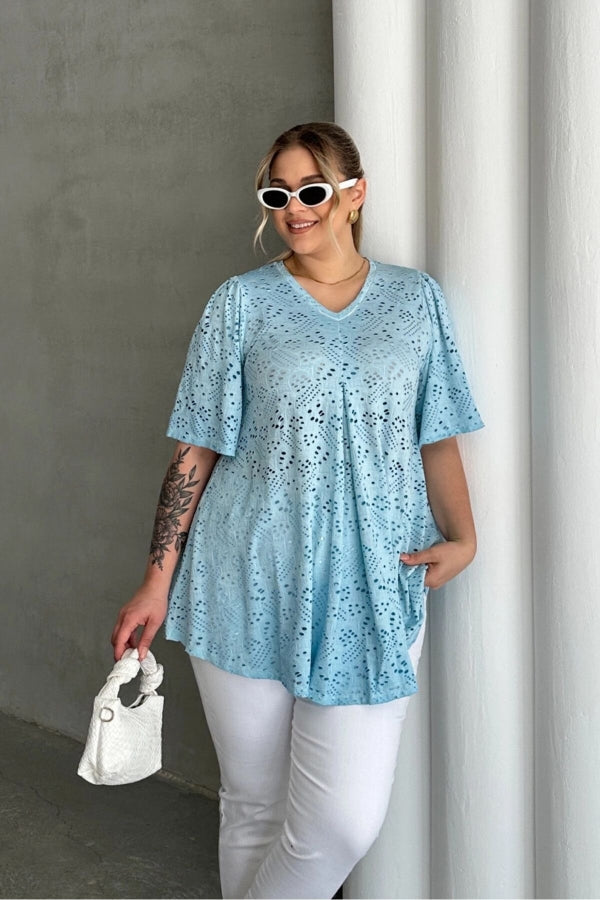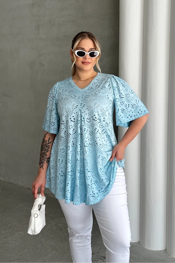 Büyük Beden V Yaka Kısa Kollu Dantel Detaylı Astarsız Bluz 302957