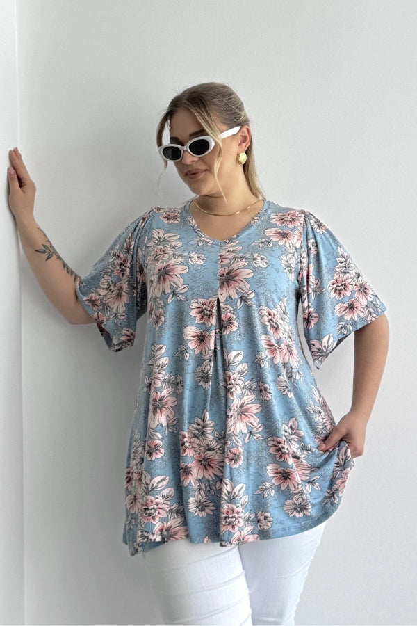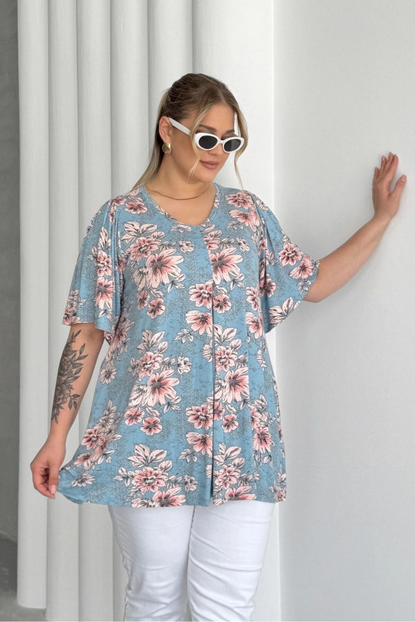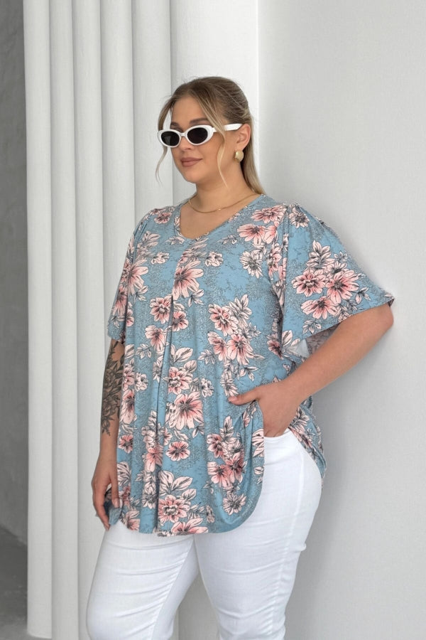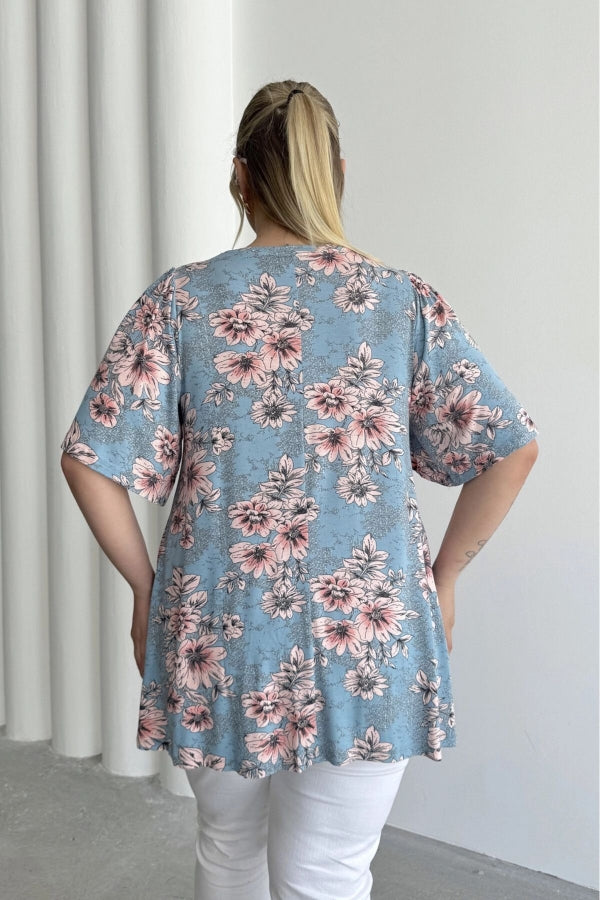 Büyük Beden V Yaka Kısa Kollu Eteği Bollaşan Desenli Bluz 101-44