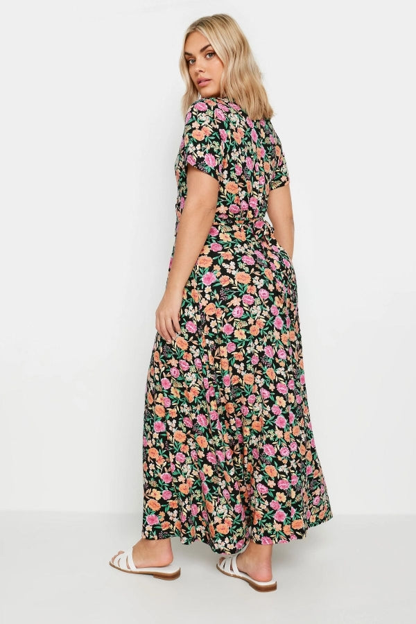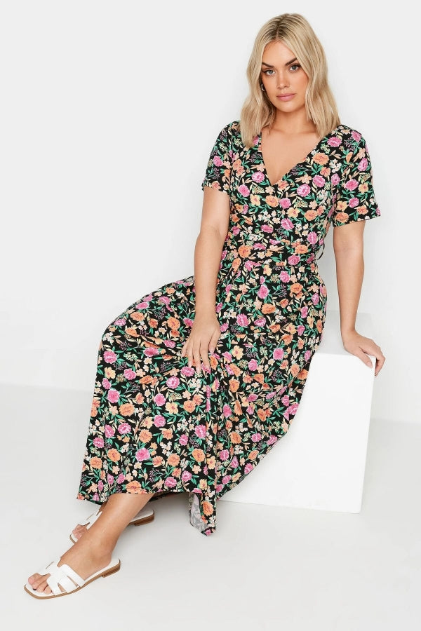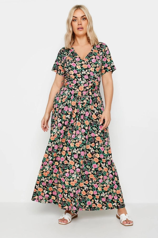 Büyük Beden V Yaka Kısa Kollu Kuşaklı Desenli Uzun Elbise 137822