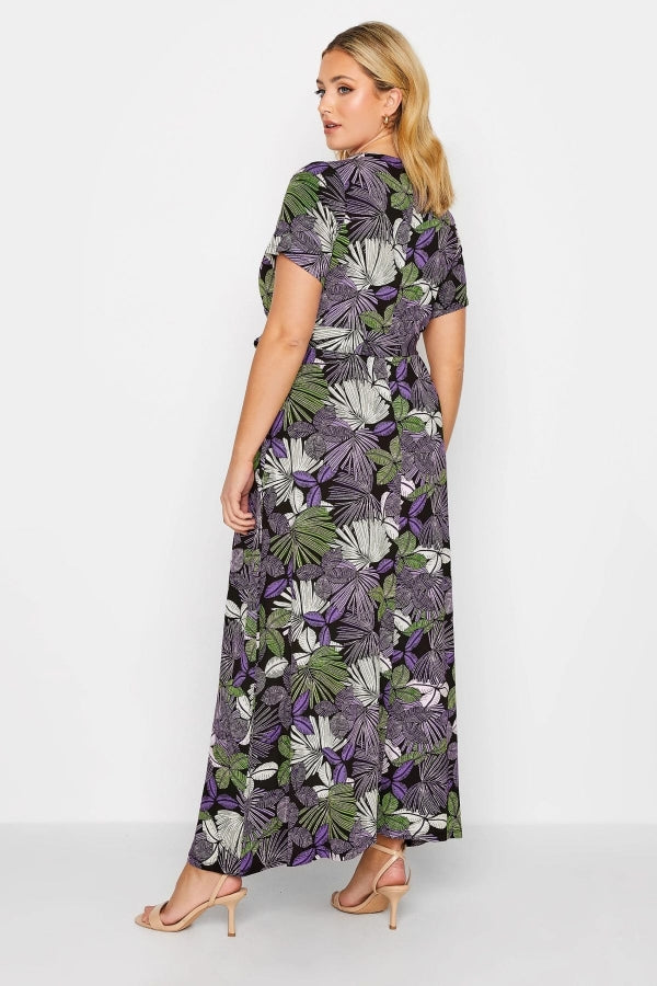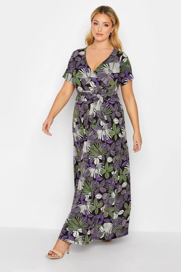 Büyük Beden V Yaka Kısa Kollu Kuşaklı Desenli Uzun Elbise 301609