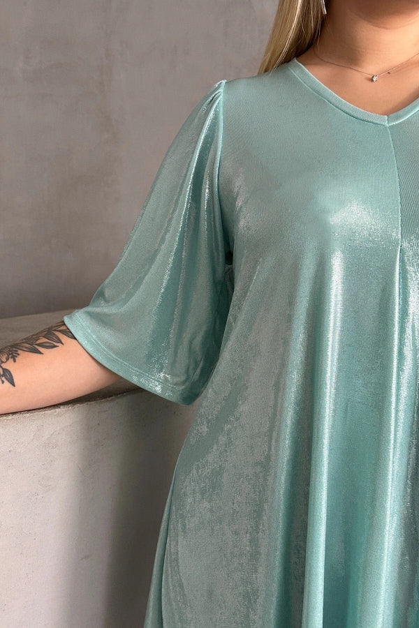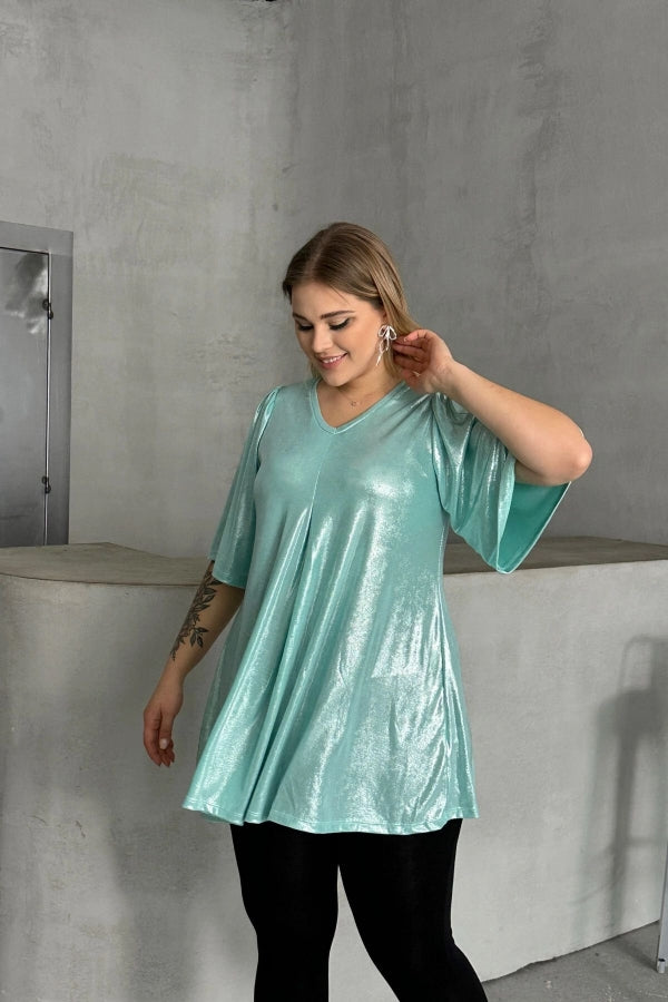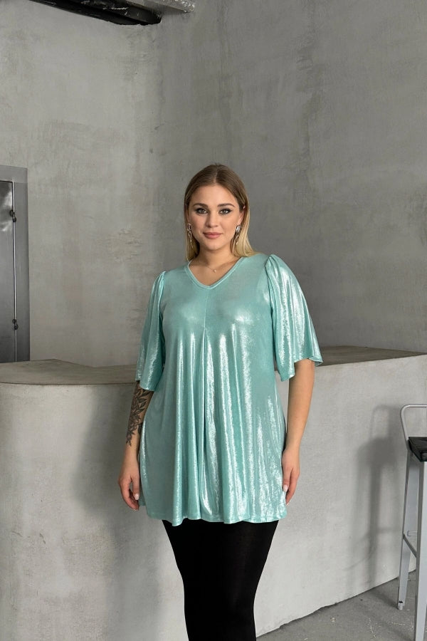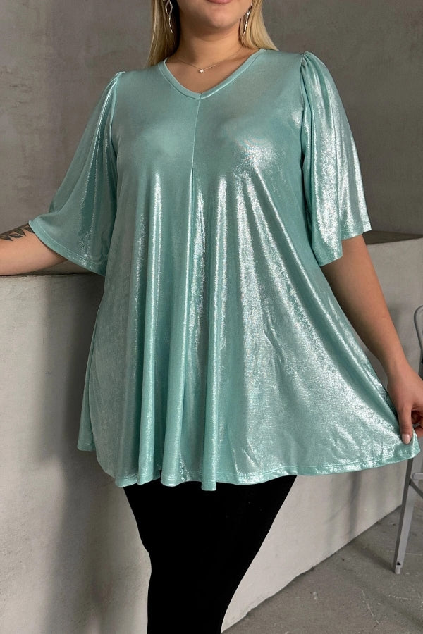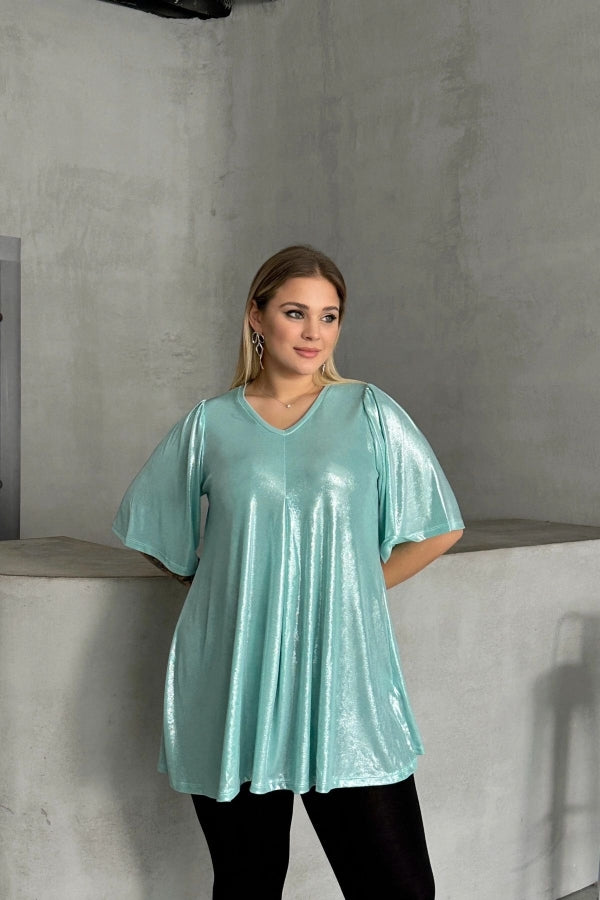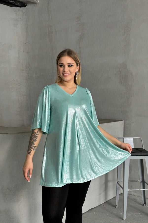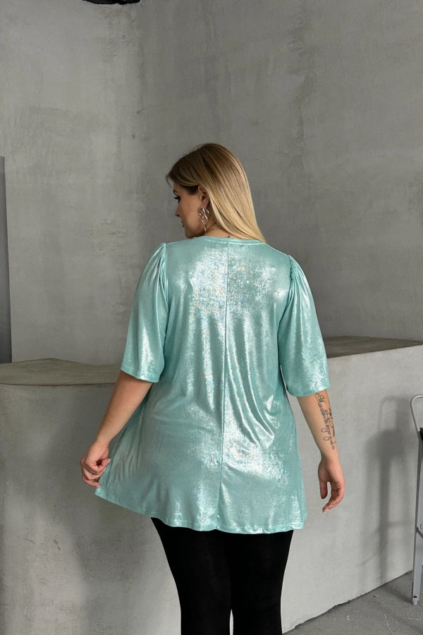 Büyük Beden V Yaka Kısa Kollu Parlak Görünümlü Bluz 303379