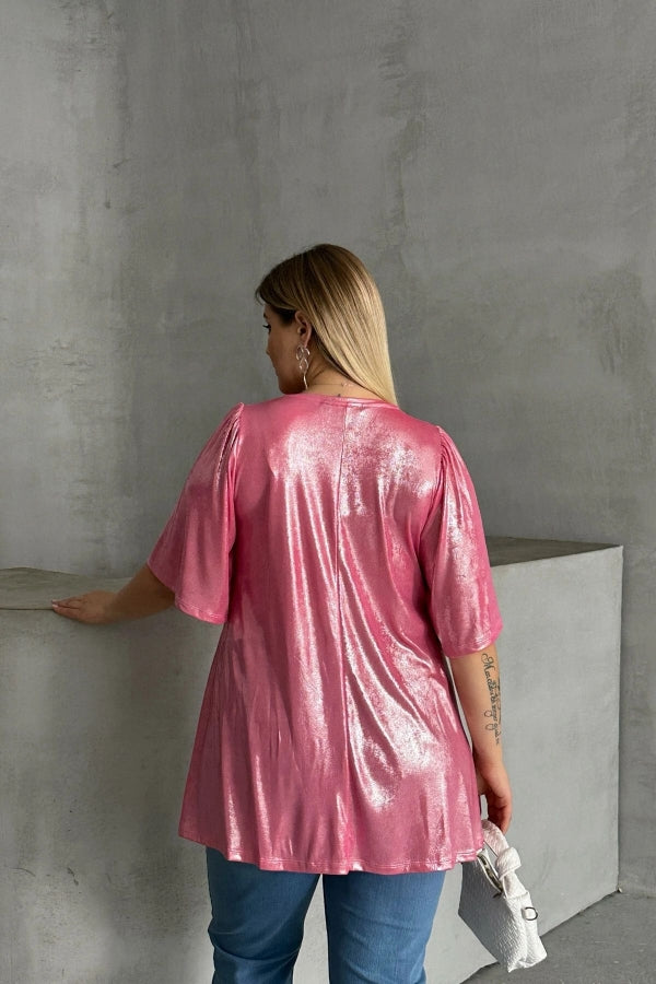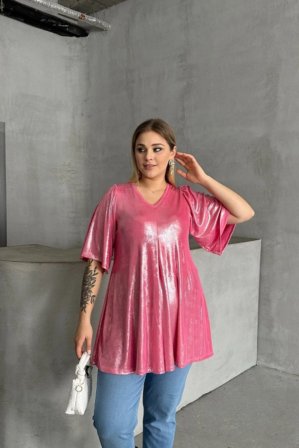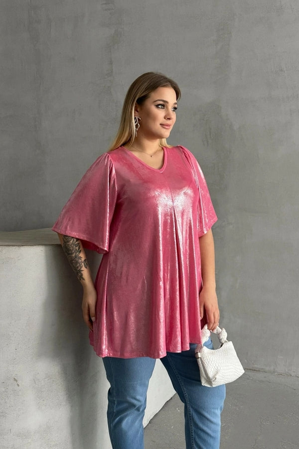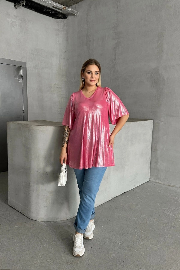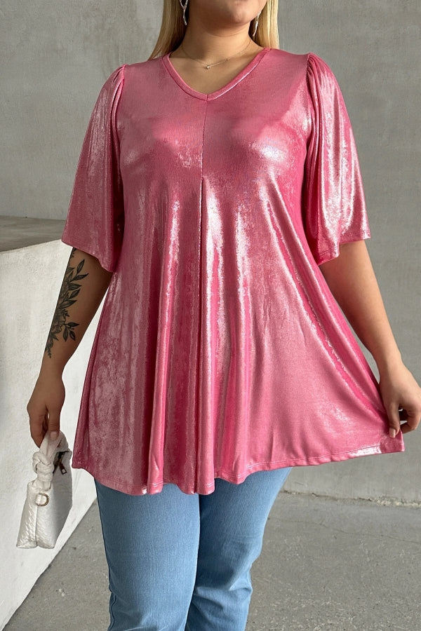 Büyük Beden V Yaka Kısa Kollu Parlak Görünümlü Bluz 303380