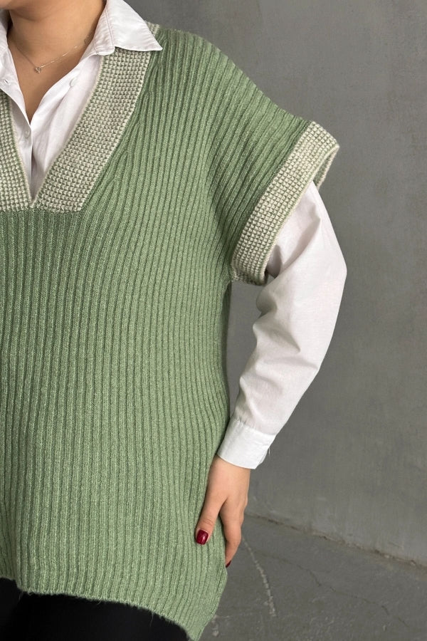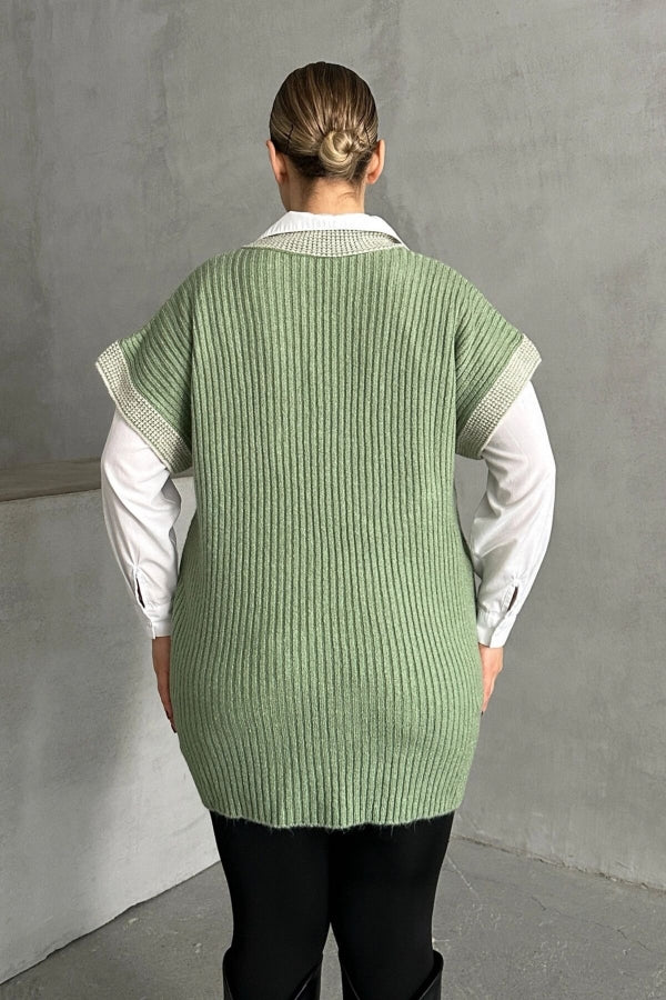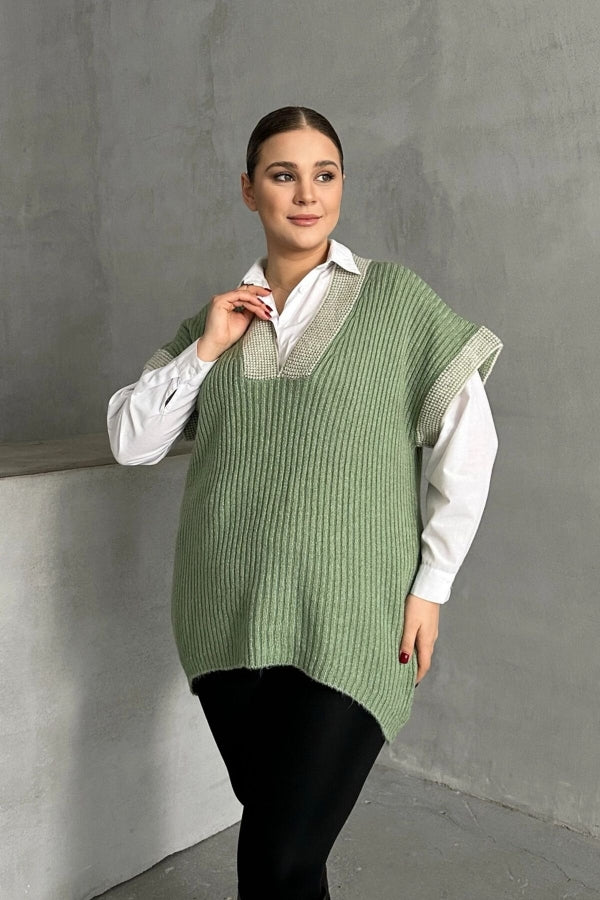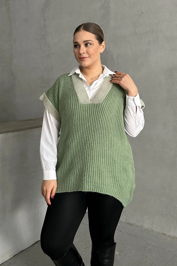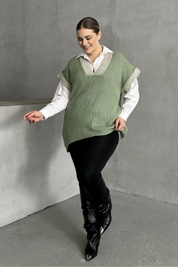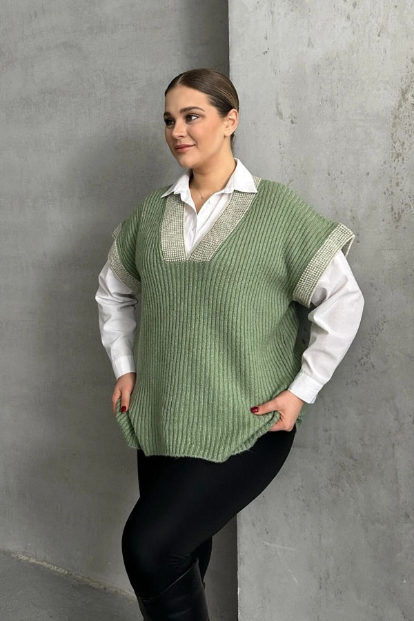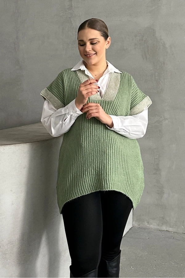 Büyük Beden V Yaka Kısa Kollu Triko Süveter 302136