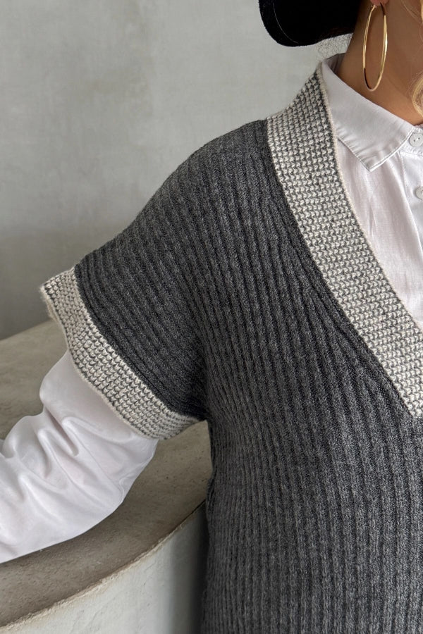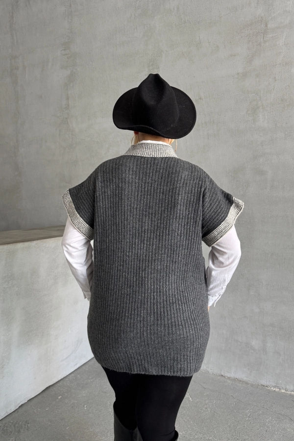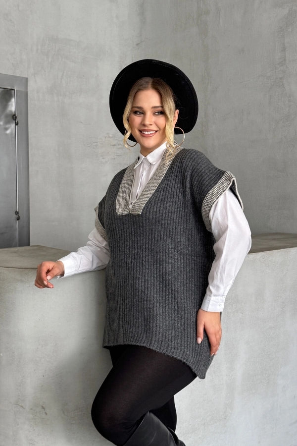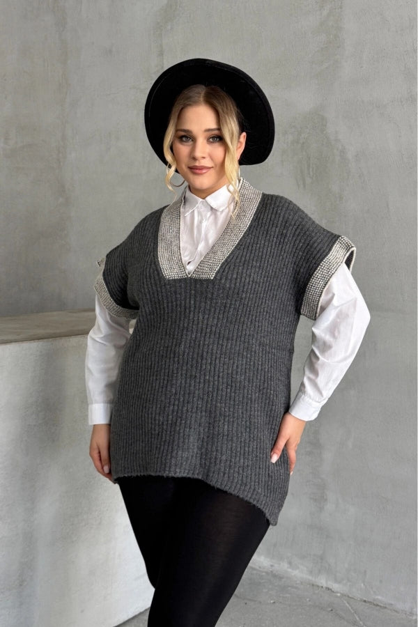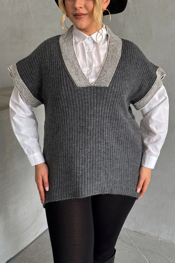 Büyük Beden V Yaka Kısa Kollu Triko Süveter 302138
